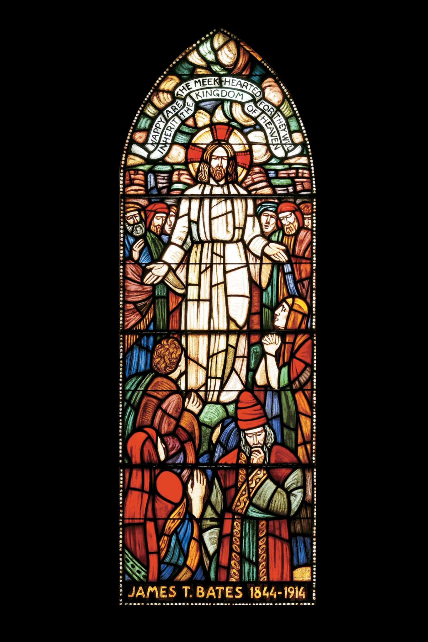 HAPPY ARE THE MEEK-HEARTED FOR THEY WILL / INHERIT THE KINGDOM OF HEAVEN (banderoles en dessus du Christ) // JAMES T. BATES 1844-1914 (bandeau en bas)