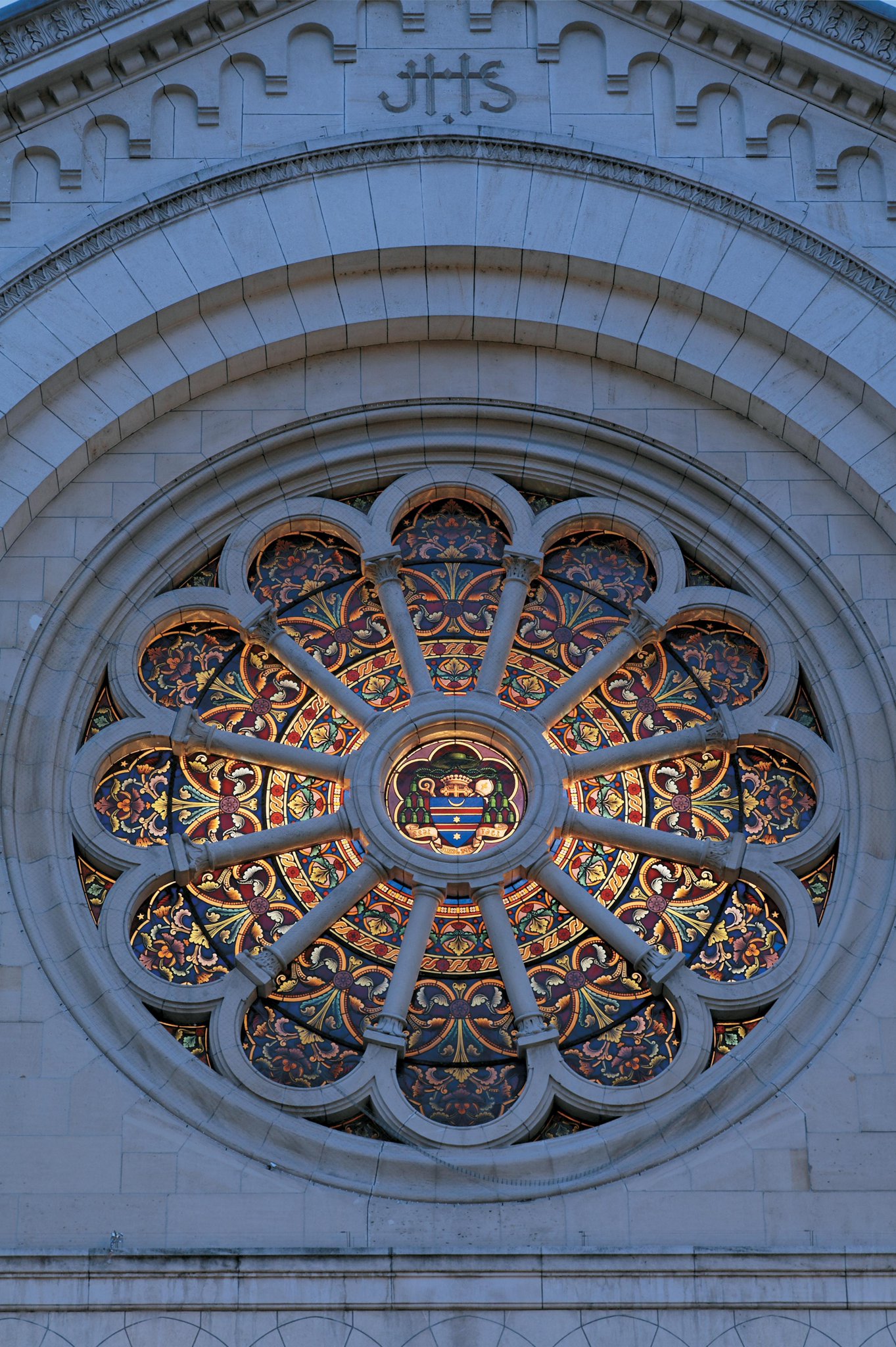 Rosace au décor végétal et géométrique, avec les armoiries de saint François de Sales au centre