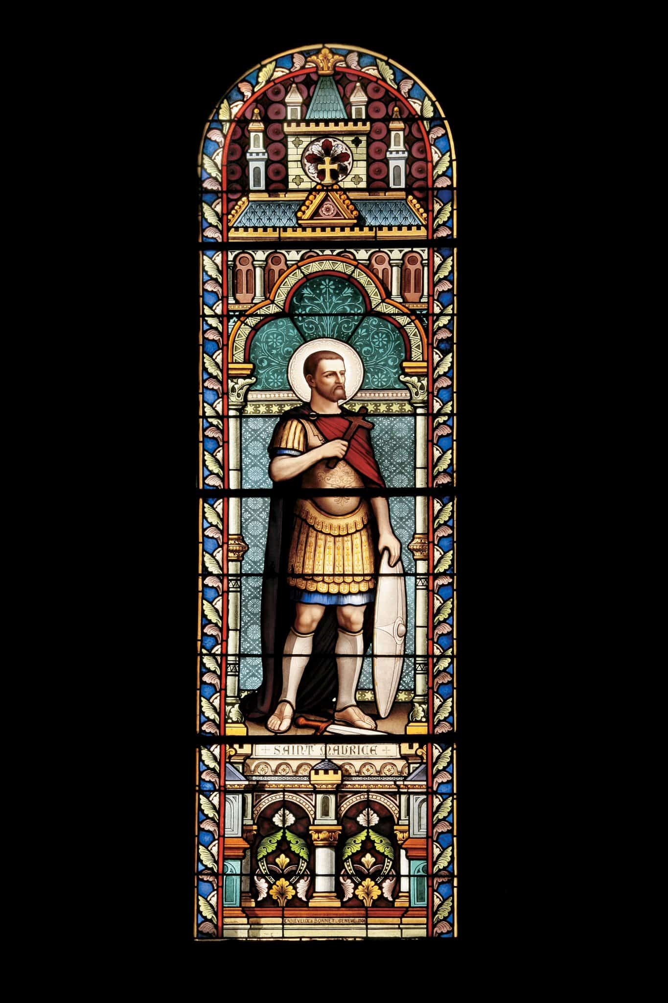 Saint Maurice, représenté en soldat romain, une épée à ses pieds, porte un bouclier et un crucifix.