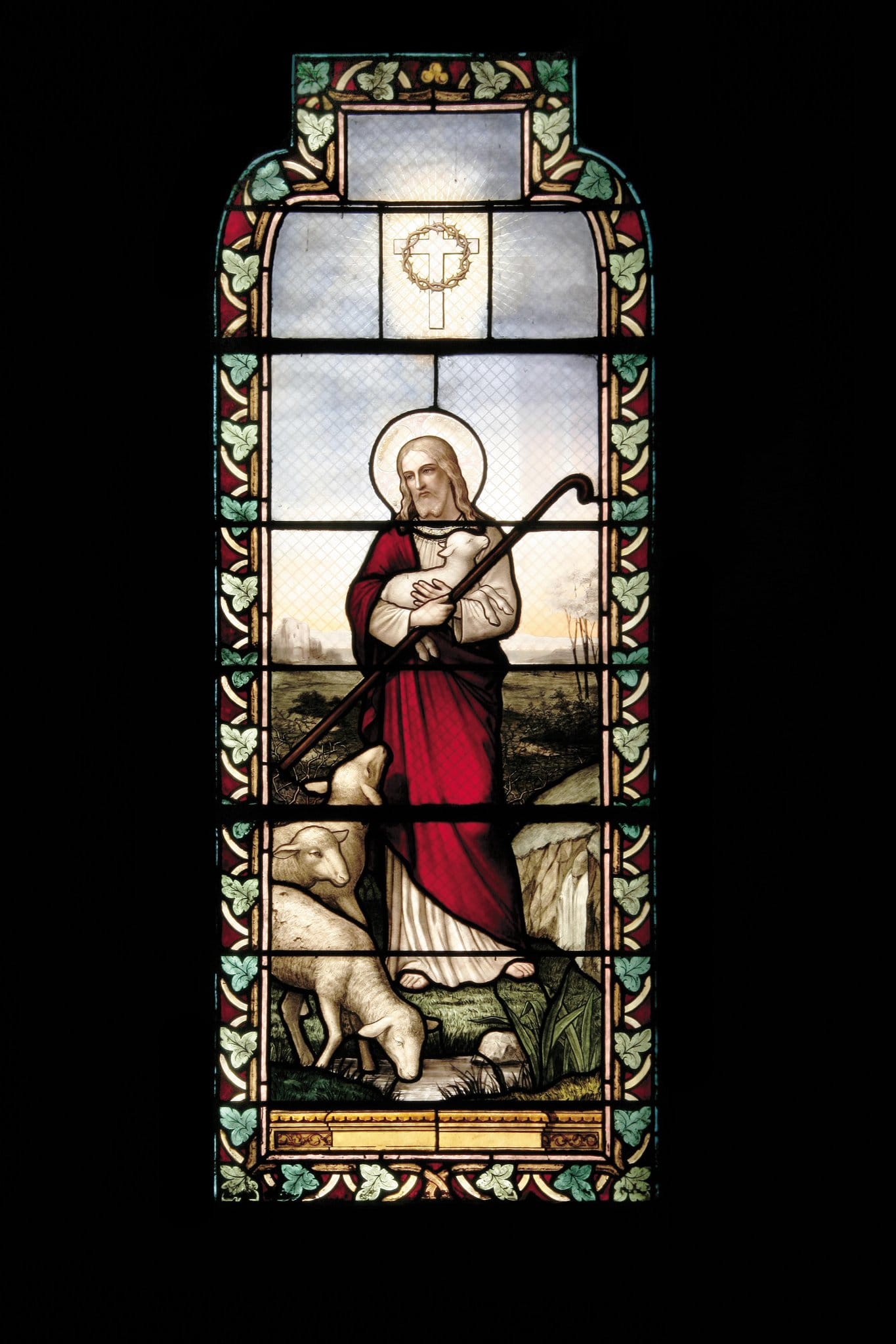 Jésus porte un agneau dans ses bras et un bâton de berger. Au-dessus, il y a une croix et une couronne d’épines.
