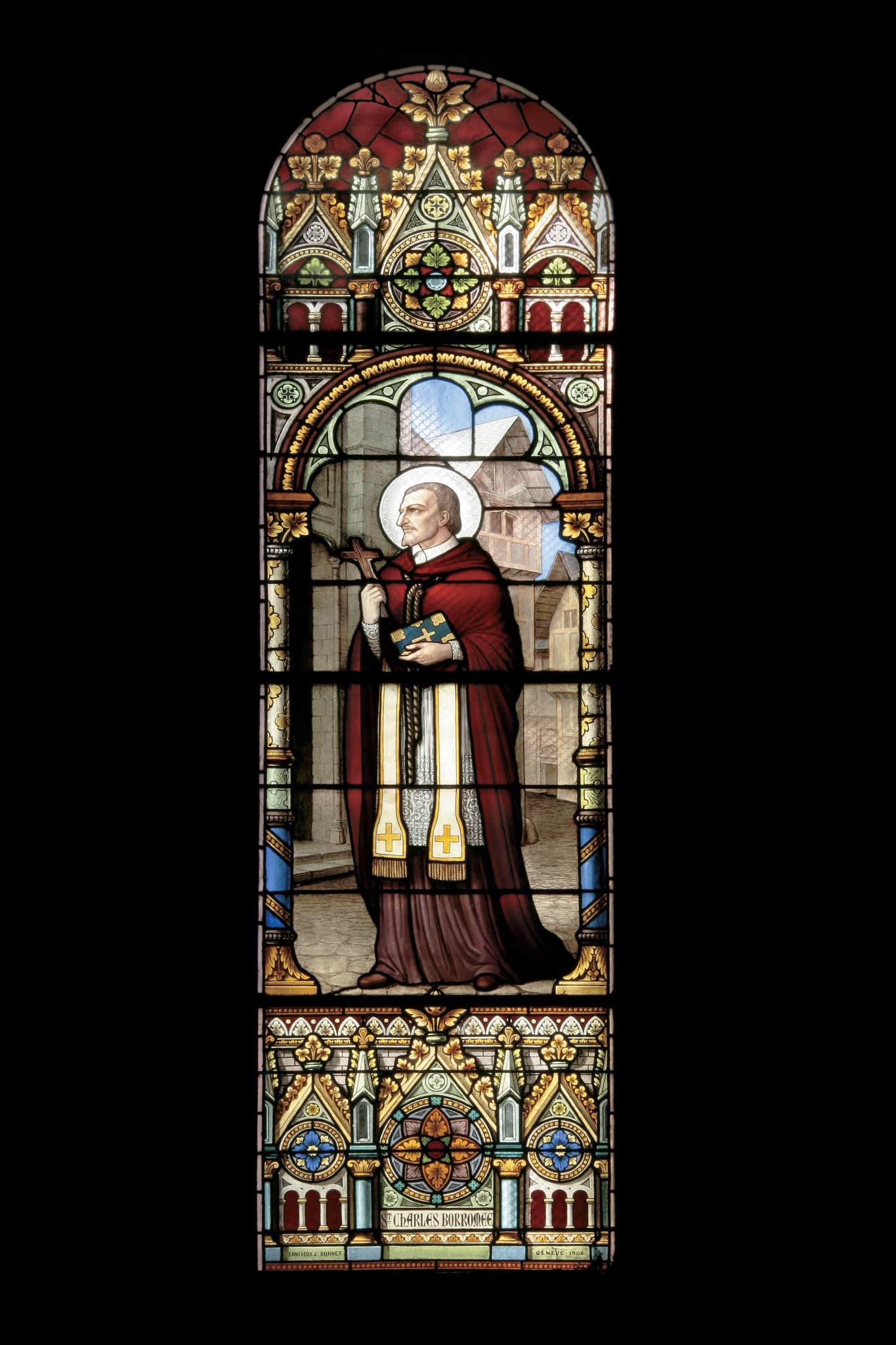 Saint Charles Borromée, devant une église, tient la Bible et une croix.