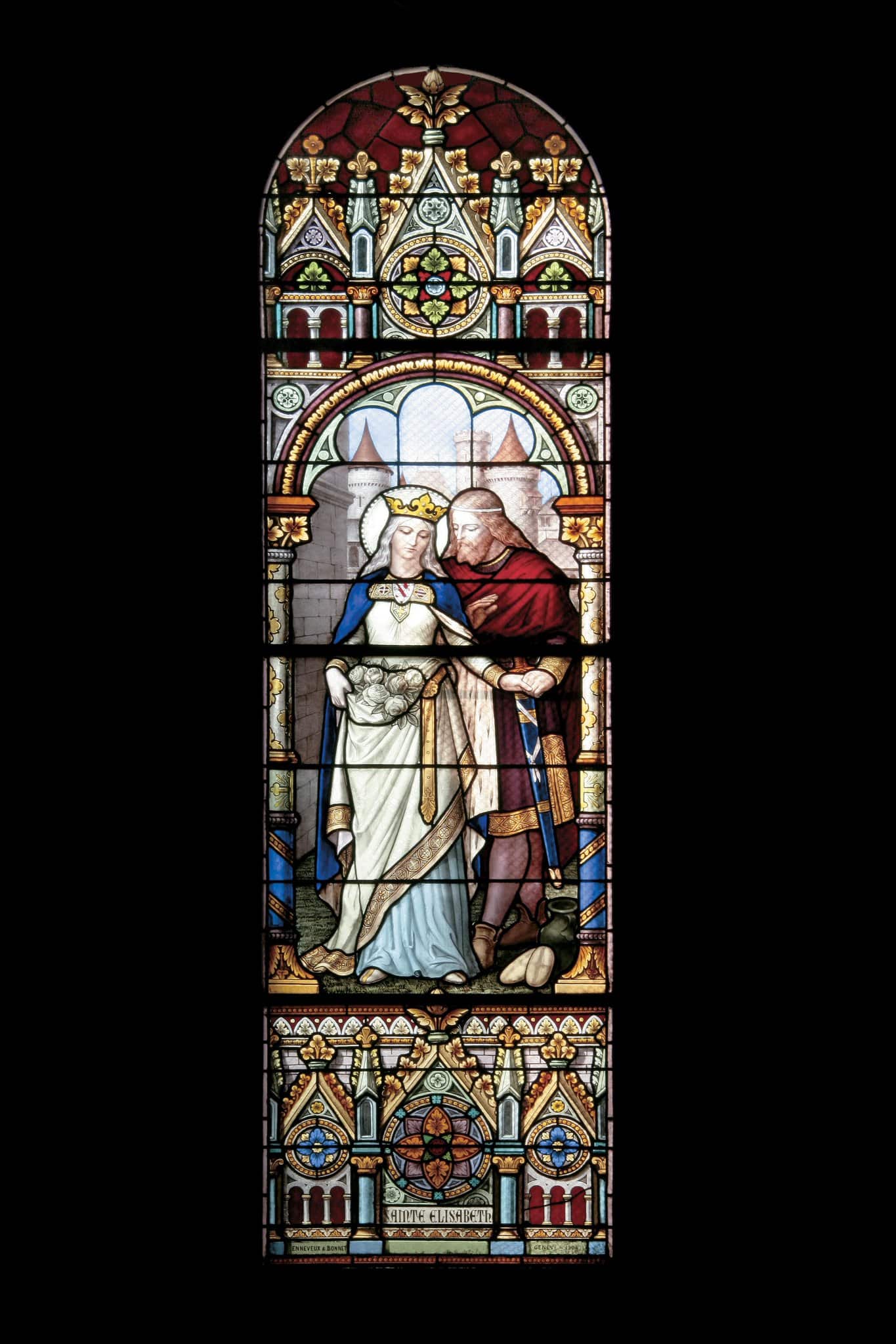 Sainte Elisabeth de Hongrie, vêtue en princesse couronnée, porte des roses dans le pli de sa robe. Derrière elle, son beau frère lui demande ce qu’elle cache. A l’arrière plan, le château
