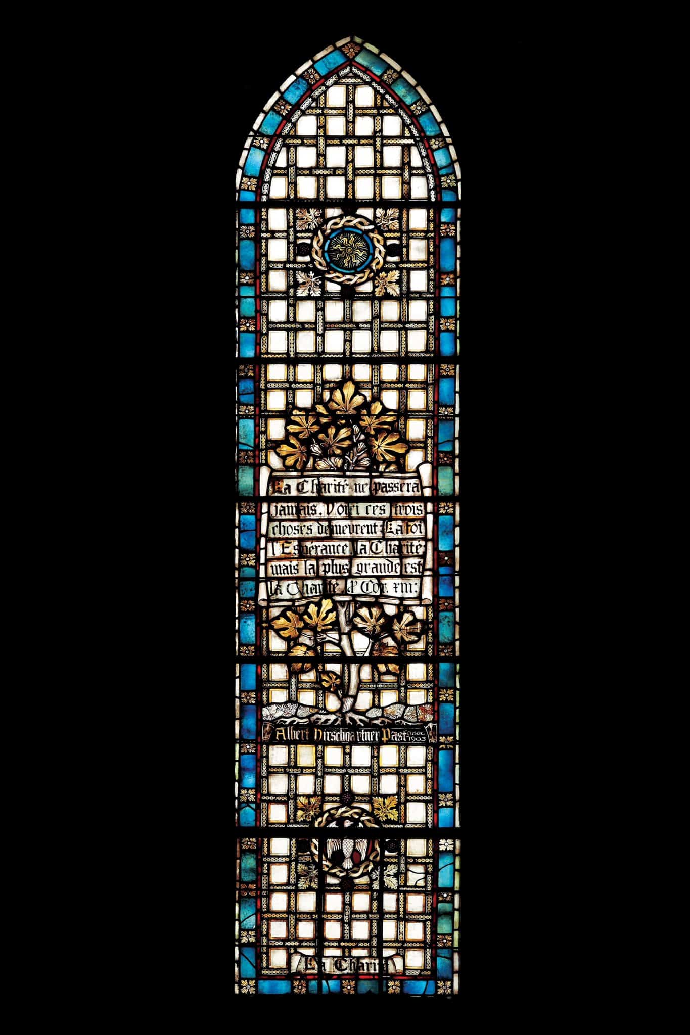 Le vitrail rappelle le nom du pasteur Hirschgartner avec la colombe de la Charité et le figuier.
