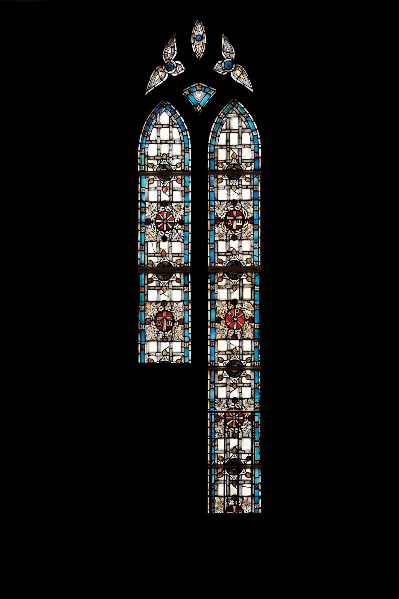 Sur chaque lancette on trouve des médaillons avec le chrisme ou la croix entourée de l’alpha et de l’oméga.
