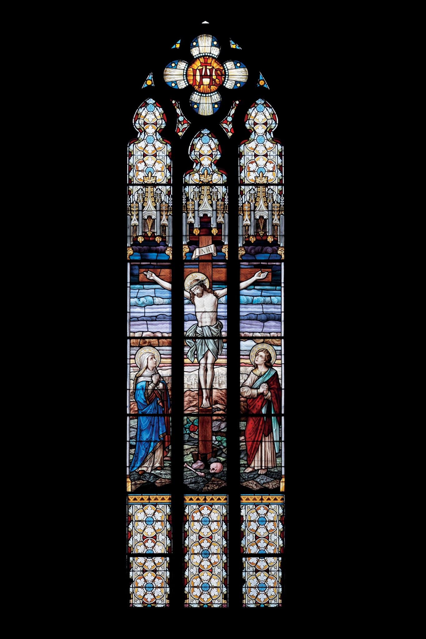 Le Christ crucifié est entouré de Marie et de Jean. Au pied de la croix, un crâne et un os. Dans le fonds, la ville de Jérusalem.