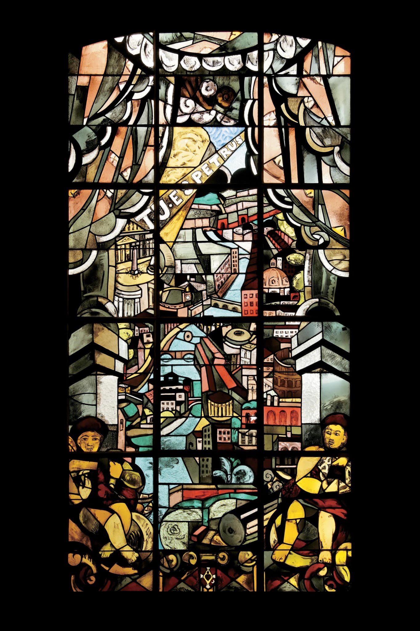 Pour les deux roses du transept, Cingria envisage un programme iconographique original, inspiré de La légende de la Vraie Croix de Piero della Francesca à Arezzo, que l’artiste avait pu admirer lors de ses séjours florentins entre 1904 et 1909. Il s’agit d’un récit issu de la Légende dorée de Jacques de Voragine, relatant l’histoire de la Croix jusqu’à son retour à Jérusalem au VIIème siècle, où elle est rapportée par l’empereur byzantin Heraclius (Rudaz, 1998, p. 77). Cingria choisit deux épisodes importants, l’un consacré à la Victoire de Constantin sur Maxence (GE_04.01) et l’autre à l’Invention de la Sainte Croix (GE_04.03). D’un grand dynamisme et dans des coloris par trop outranciers aux yeux de certains en plus d’un manque de lisibilité, ces verrières posées en 1924 font l’objet de violentes critiques qui aboutissent à la suspension du programme par le vicaire général, Mgr Petite. Celui-ci ne peut concevoir que “les rébus de Cingria aient leur place dans les églises”, sentiment partagé selon lui par les fidèles, qui “souhaitent que l’autorité ecclésiastique arrête de transformer leurs sanctuaires en musée des horreurs” (Petite, 1927a). Mgr Besson nuance les propos du vicaire général en lui disant que l’Église ne peut systématiquement refuser tout ce que Cingria réalise. Il propose d’exiger de l’artiste qu’il leur présente à chaque fois ses cartons et qu’il se plie à accepter les éventuelles modifications qui lui seraient demandées (Besson, 1927). Mgr Petite finit par accepter que l’artiste puisse poursuivre son travail mais avec une contrainte de taille : l’interdiction stricte de représenter des figures (Petite, 1927b). Cingria doit donc se contenter de vitraux ornementaux (Poiatti, 2008, p. 125), ce qui convient au vicaire général qui reconnaît à l’artiste un certain talent de coloriste (Petite, 1927a). L’artiste a parfaitement conscience que ce qu’un certain clergé craint le plus dans son art et dans celui de ses amis du Groupe de Saint-Luc, c’est leur façon de traiter la figure humaine. Il écrit dans ses Souvenirs d’un peintre ambulant, non sans humour, que si l’on s’en tenait à un art purement décoratif, il serait possible de “renouveler sans bruit et en douce tout l’art chrétien dans tous les pays” (Cingria, 1933, p. 31).