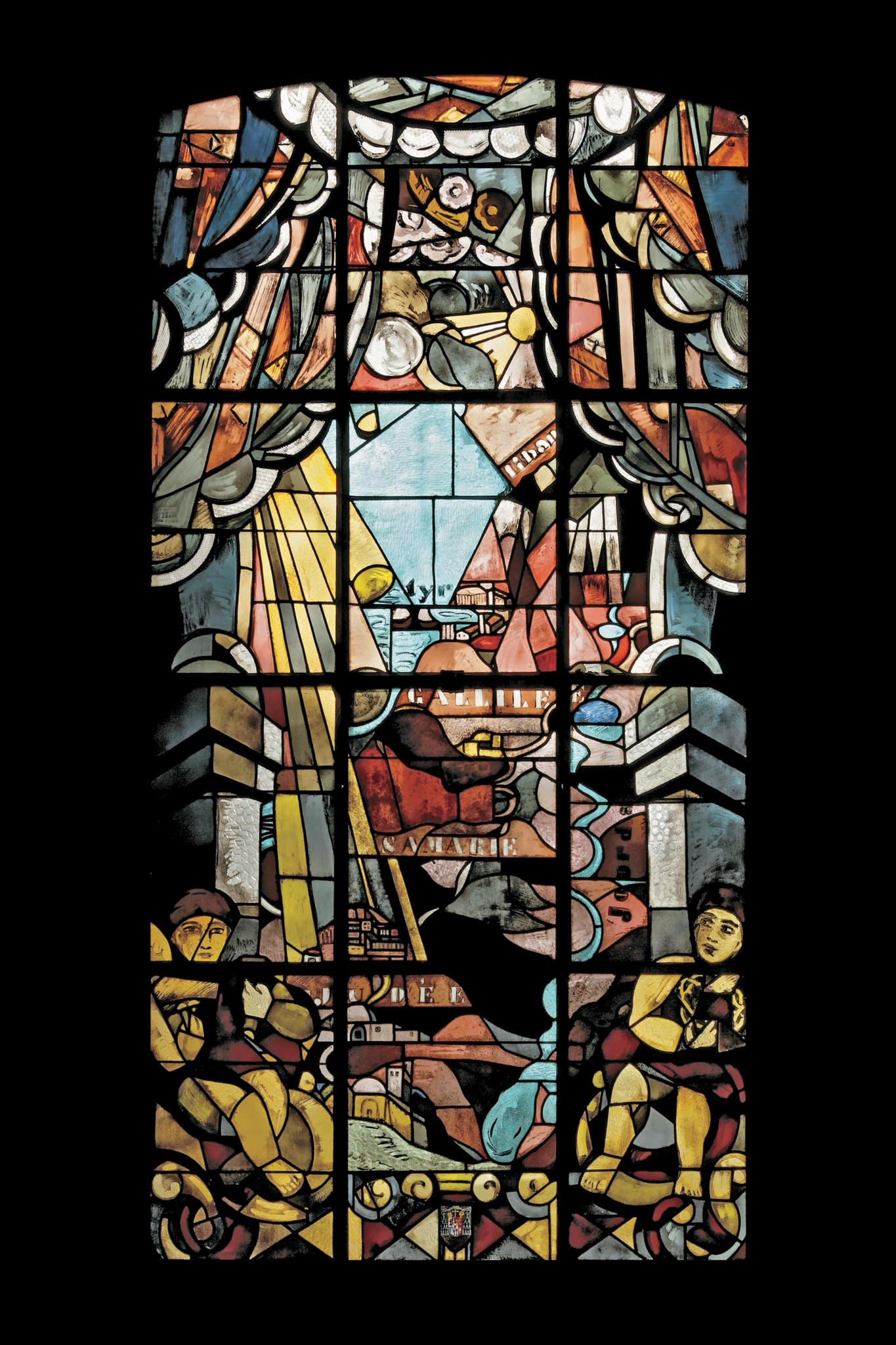 Pour ces quatre verrières du transept, Cingria cherche une solution innovante qui puisse lui permettre de poursuivre le programme consacré à l’Invention de la Sainte Croix sans avoir recours à des scènes narratives mettant en scène des personnages, et imagine des vues des lieux de la Légende de la vraie Croix dessinées à la manière de cartes de géographie anciennes. Il théâtralise la représentation par des rideaux qui s’entrouvrent sur ces vues à vol d’oiseau, alors que des angelots tenant les instruments de la passion au premier plan se réfèrent à la Légende de la vraie Croix (Poiatti, 2008, p. 125).