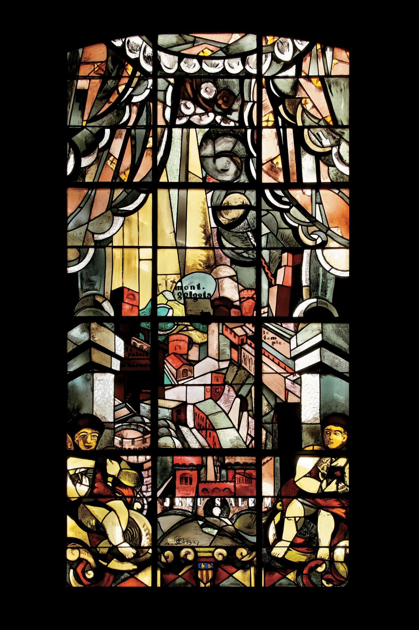 Pour ces quatre verrières du transept, Cingria cherche une solution innovante qui puisse lui permettre de poursuivre le programme consacré à l’Invention de la Sainte Croix sans avoir recours à des scènes narratives mettant en scène des personnages, et imagine des vues des lieux de la Légende de la vraie Croix dessinées à la manière de cartes de géographie anciennes. Il théâtralise la représentation par des rideaux qui s’entrouvrent sur ces vues à vol d’oiseau, alors que des angelots tenant les instruments de la passion au premier plan se réfèrent à la Légende de la vraie Croix (Poiatti, 2008, p. 125).
