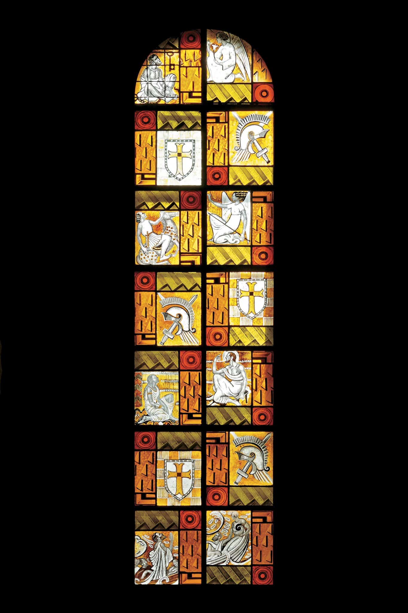 Des rectangles décoratifs s’alternent à des rectangles illustrant des scènes de la vie de Pierre et Paul. De haut en bas : un ange délivre Pierre de la prison, la vision de Paul sur le chemin de Damas, Pierre prêche devant une femme, Paul dans une barque lors de ses voyages d’évangélisation. Une épée, un casque et un bouclier apparaissent entre chaque scène.
