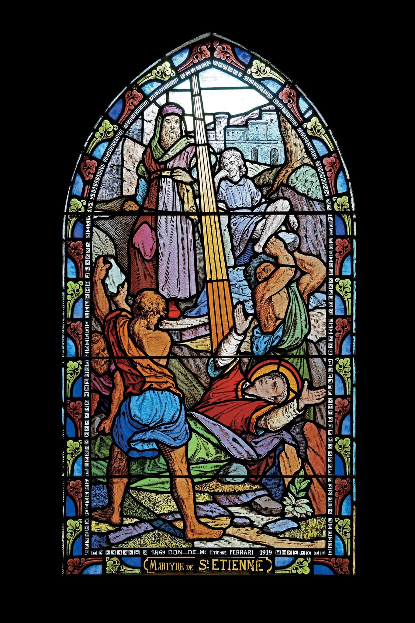 1869 DON DE MR. ETIENNE FERRARI 1919 (bordure de la scène) / MARTYRE DE St ETIENNE (bandeau en bas au centre)