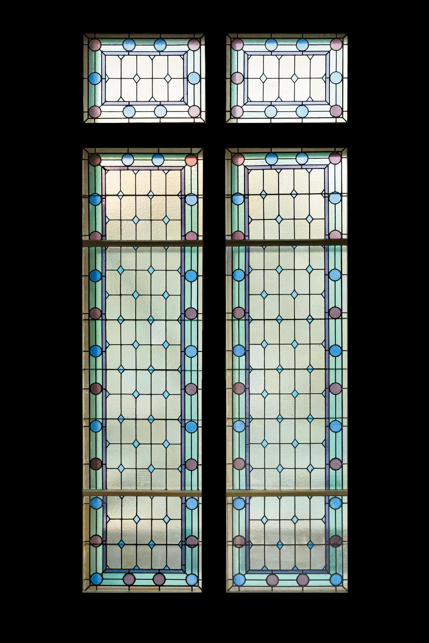 Cage d’escalier entre le rez et le 1er étage, vitrail de gauche