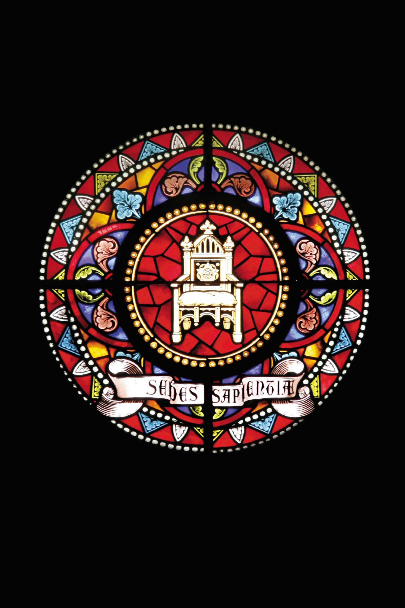 Une rose aux motifs végétaux avec au centre le siège de la sagesse