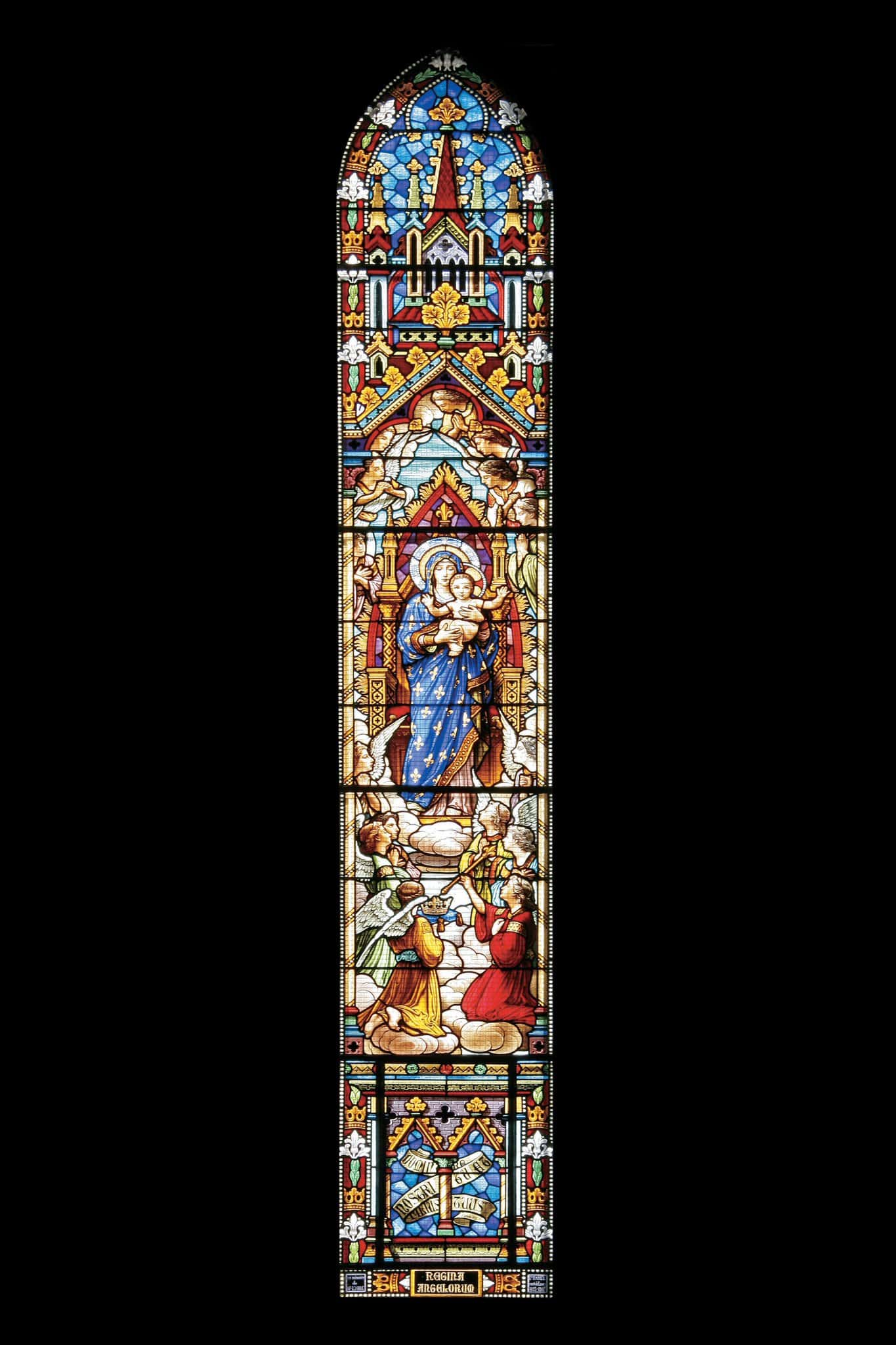 DOMINAE NOSTRI TU ET MURIS TUUS JUDIC. VIII. 22 (phylactère au centre) / REGINA / ANGELORIUM (cartouche en bas au centre) / EN MEMOIRE / de / MR. L’ABBE (bandeau en bas à gauche) / ED RAMEL / curé de Lancy / 1895-1902 (bandeau en bas à droite)