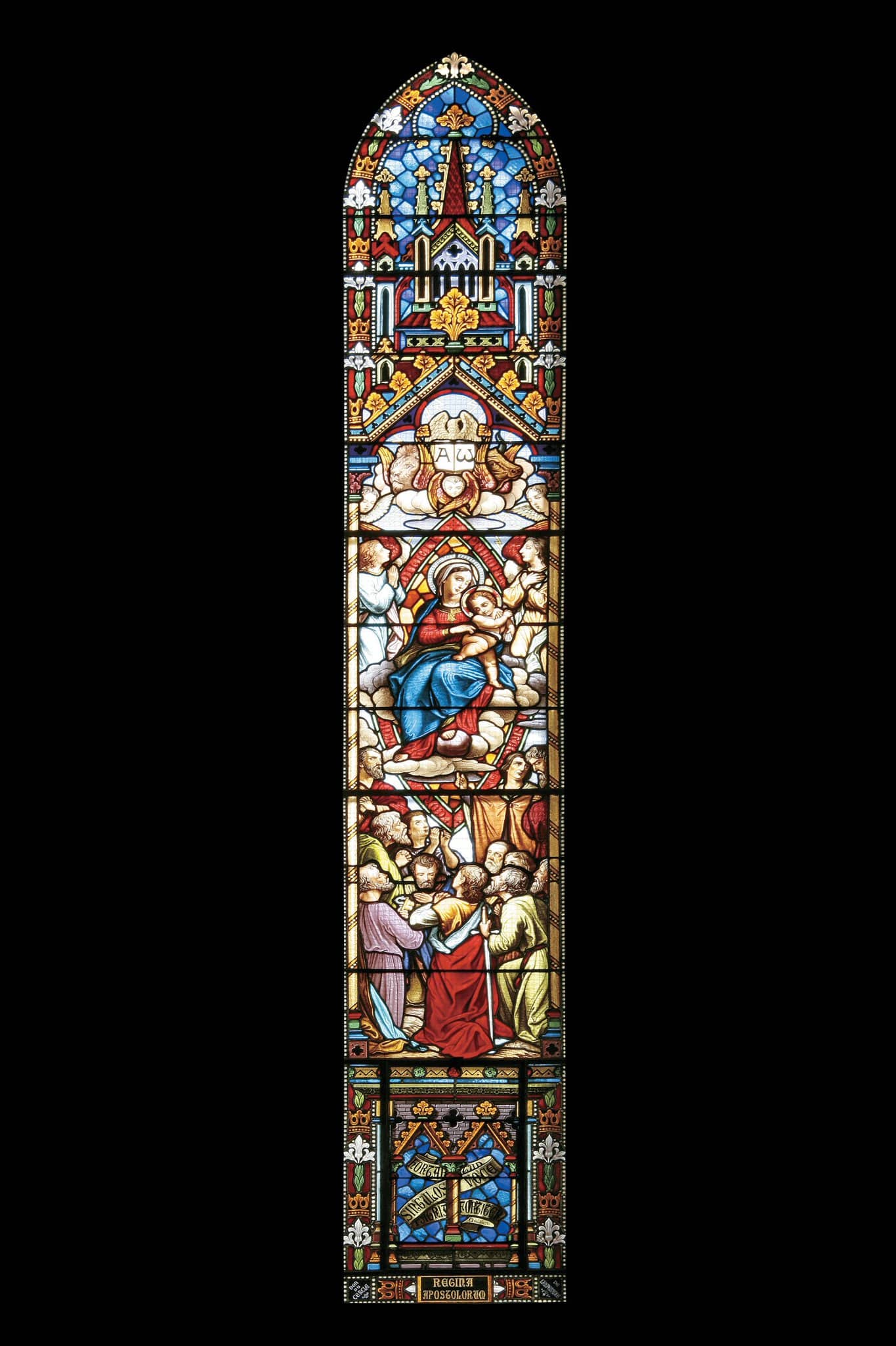 A W (Char Ezequiel) / DILIGIT PRINCIPES / COR DEUM / ISRAEL JUDIA (mandorle autour de Marie) / HORTAE TUD SINGULOS VOCE TAGRIA FORTITER MAC. VII. 21 (banderole sous la scène) / REGINA APOSTOLORUM (cartouche en bas au centre) / DON / DU / CERCLE (en bas à gauche) / DE / L’ESPERANCE (en bas à droite)