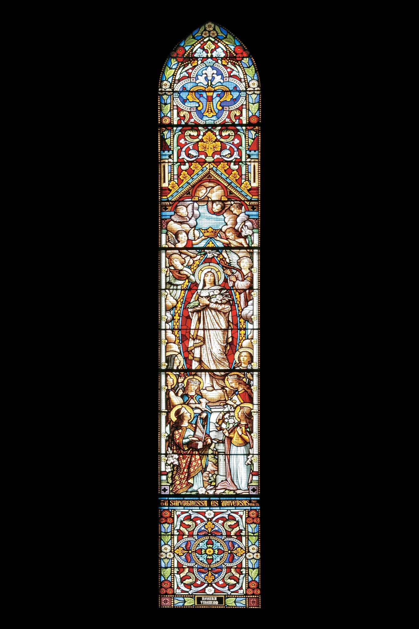Marie porte un bouquet de lys blancs. Elle est entourée d’anges dont deux d’entre eux tiennent une couronne au-dessus de sa tête. A ses pieds, différentes saintes dont Thérèse, Agathe, Cécile, Barbe, Catherine d’Alexandrie, Philomène et Agnès