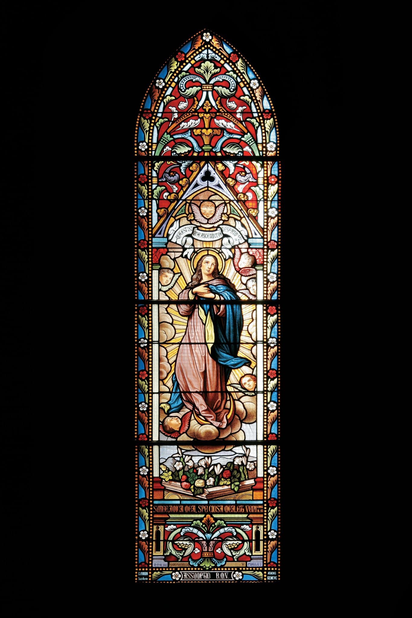 QUAE EST IST, QUAE ASCENDIT DE DESERTO / CANT. / III.6 (banderole au-dessus de la Vierge) / SURGE AMICA MEA, SPECIOSA MEA ET VENI / CANT. II.13 (bandeau sous la scène) / DON DE MADEMOISELLE V. MALLET (bandeau en bas) / ASSUMPTIO B.M.V. (cartouche sur la bordure en bas au centre)