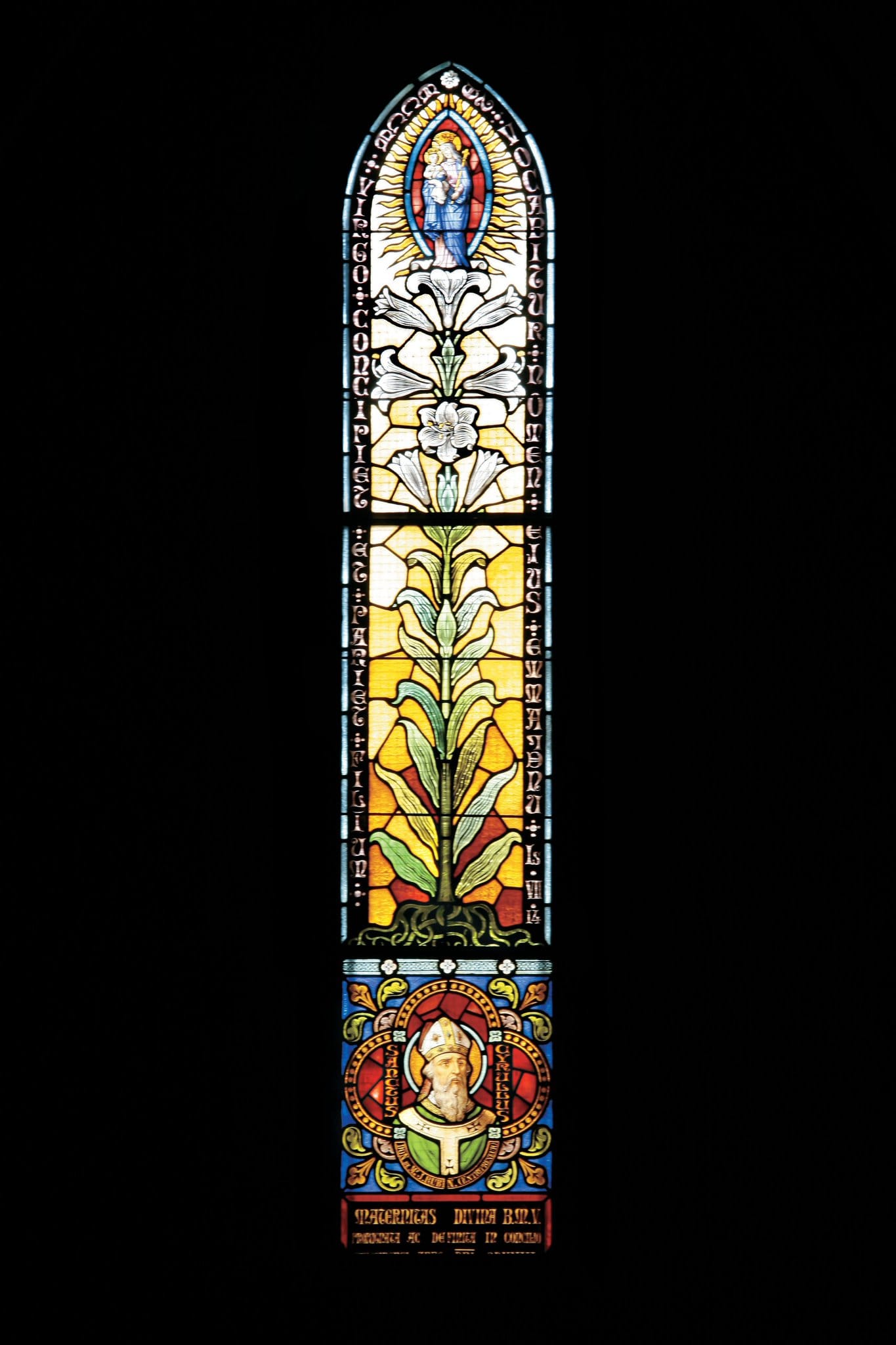 Au centre, un lys longiligne se déploie. Au-dessus, la Vierge porte l’Enfant Jésus. Tous deux sont couronnés. En bas, le portrait du pape Cyrille