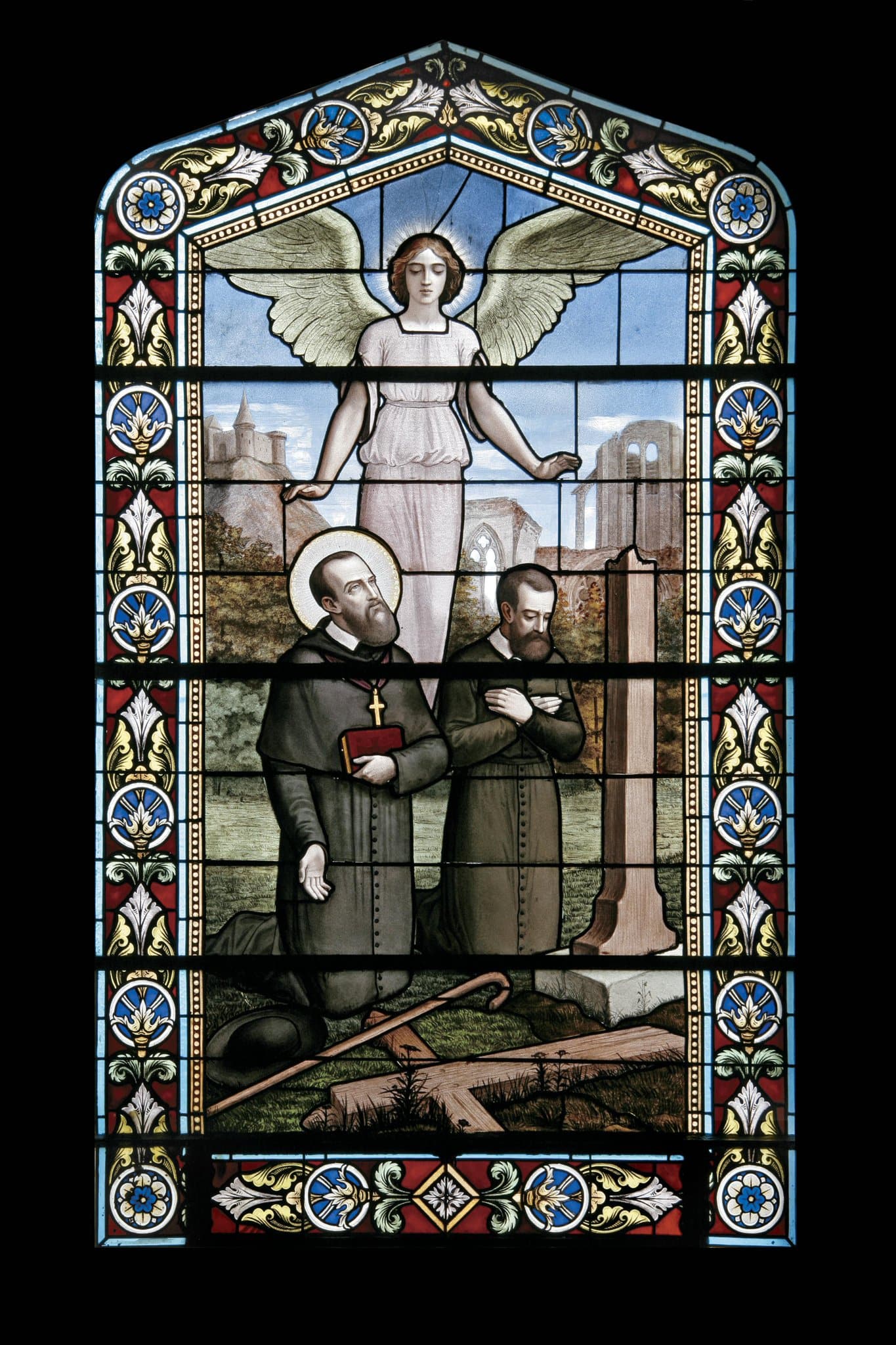 Saint François de Sales, agenouillé, prie devant une stèle avec son cousin, le chanoine Louis de Sales. A leurs pieds, une croix et derrière eux, les ruines d’une église, symbole de la ruine du catholicisme dans le Chablais, et la forteresse des Allinges. Au-dessus, un ange les protège.