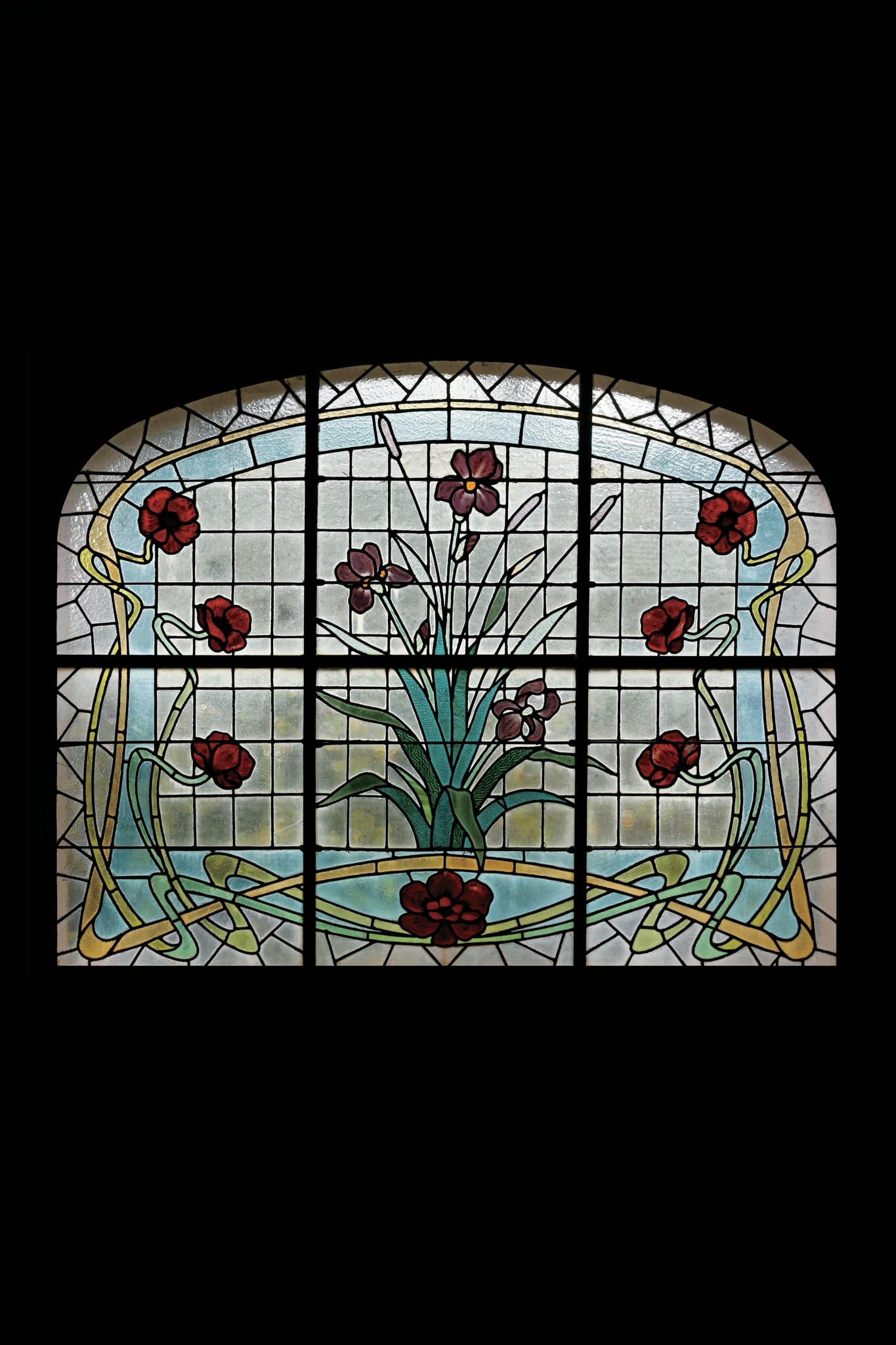 Une gerbe d’iris et de roseaux est au centre, et des cocquelicots se déploient sur le cadre.