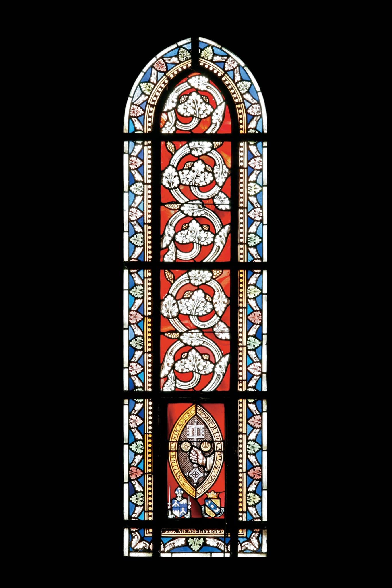 Motifs végétaux en-dessous desquels se déploient les armoiries du prieuré de Satigny. En bas, les armoiries des familles donatrices, Niepce et de Charrière.
