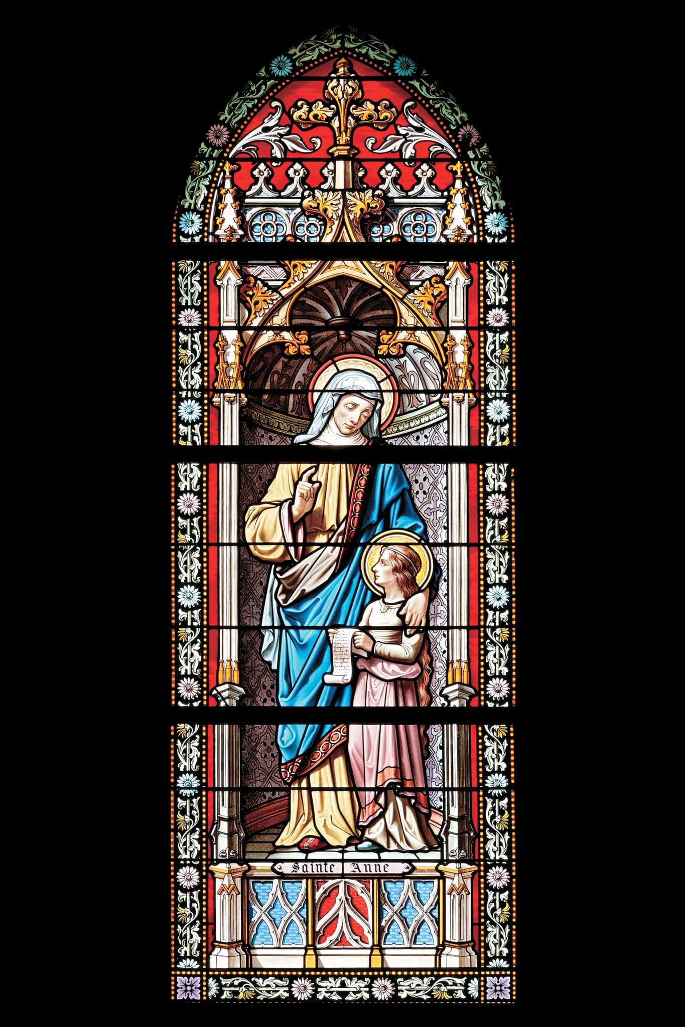 Sainte Anne entoure Marie de son bras et lui indique le ciel. Marie tient une lettre.