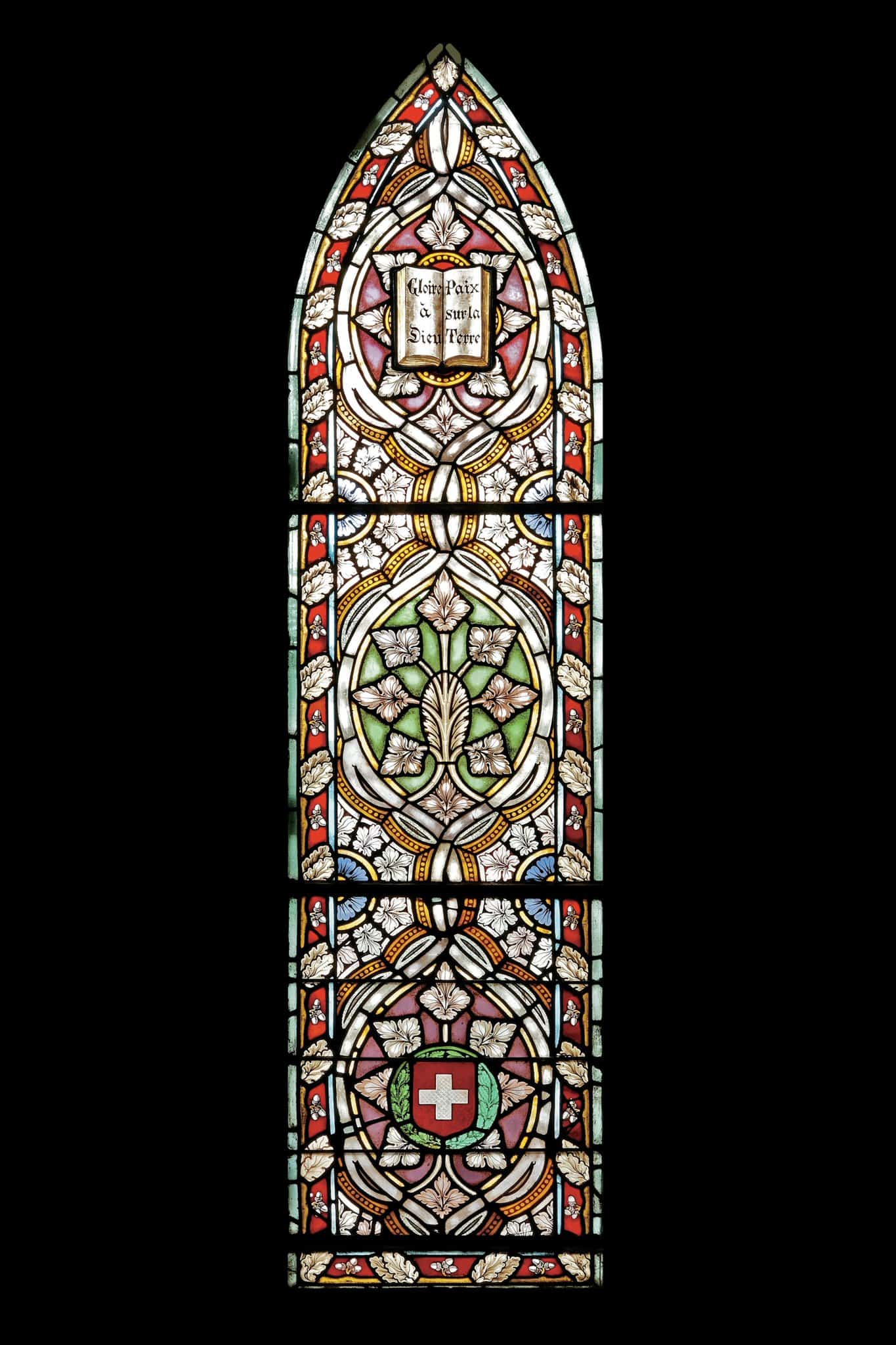 La Bible et les armoiries de la Suisse sont entourées de motifs végétaux.