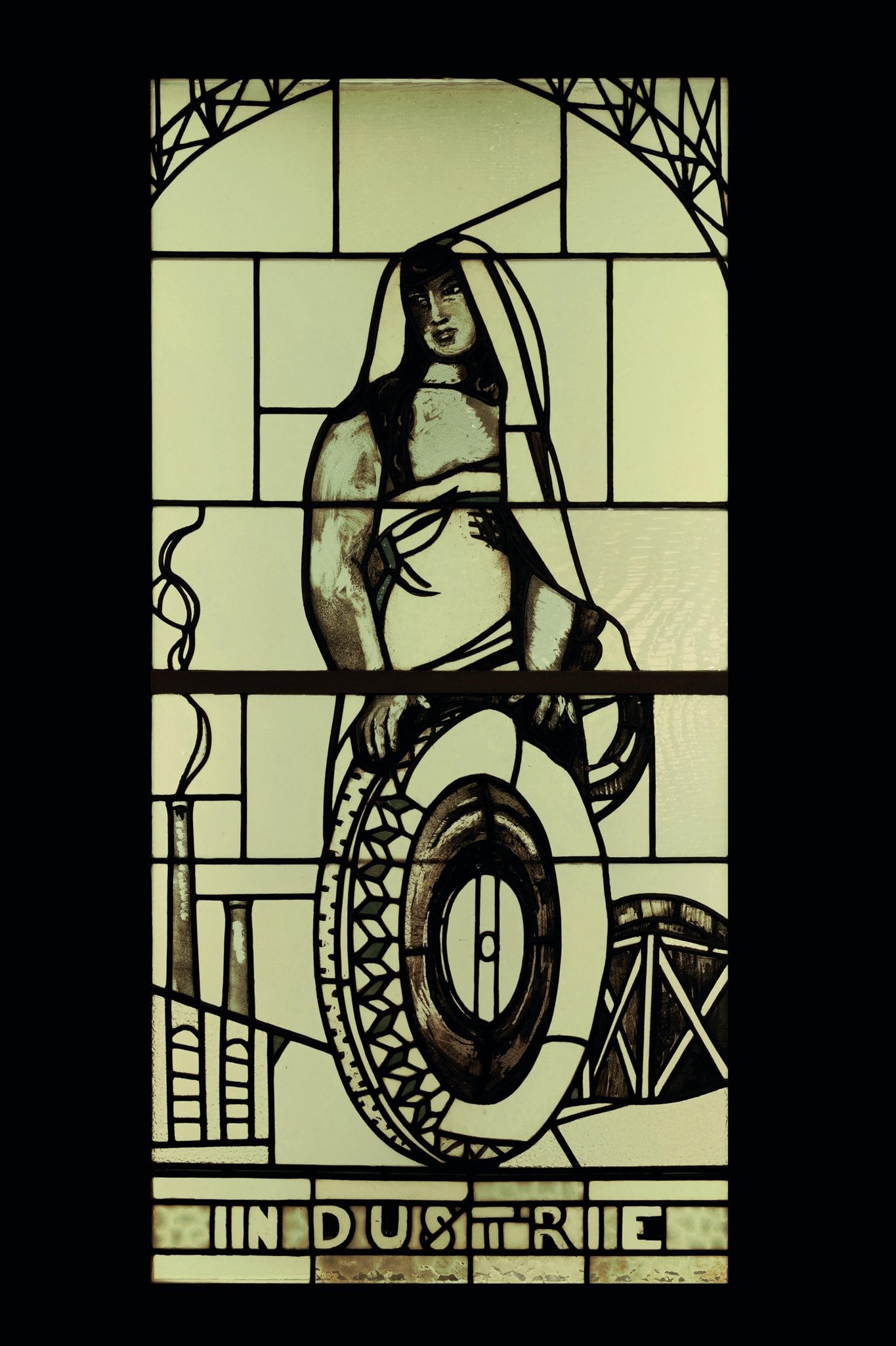 Personnification de l’industrie en une jeune femme tenant un pneu. A ses pieds, deux cheminées d’usine.