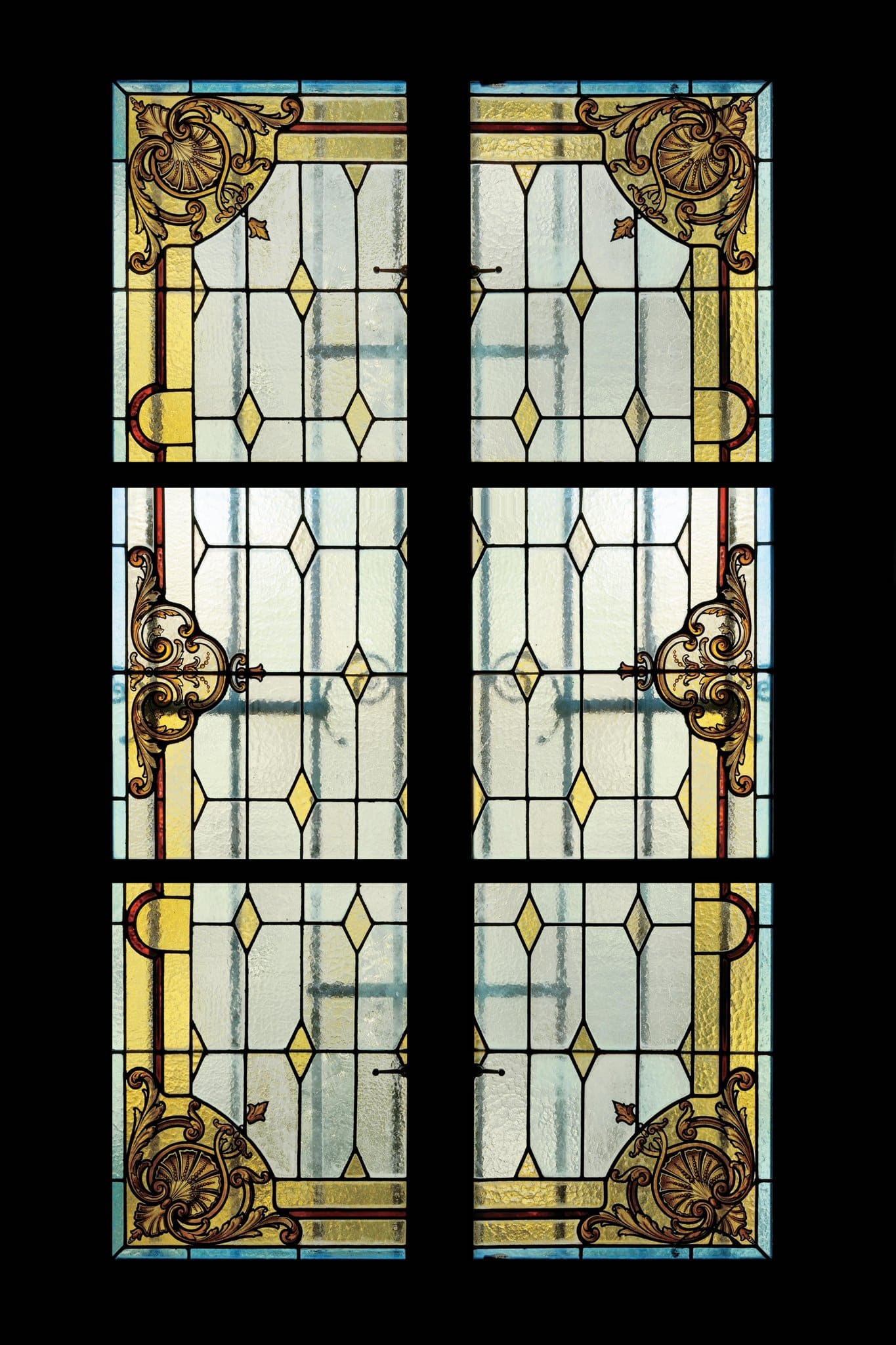 Décor géométrique encadré d’une guirlande de feuilles et de coquillages.
