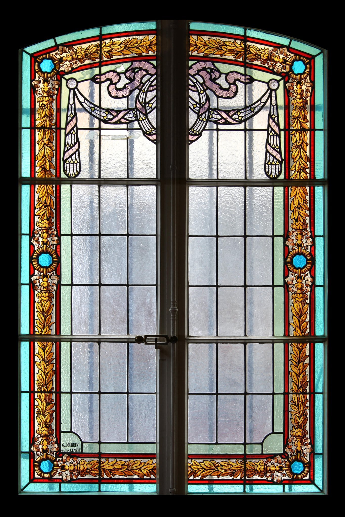 Une guirlande se trouve au sommet du vitrail, entouré d’une large bordure végétale.