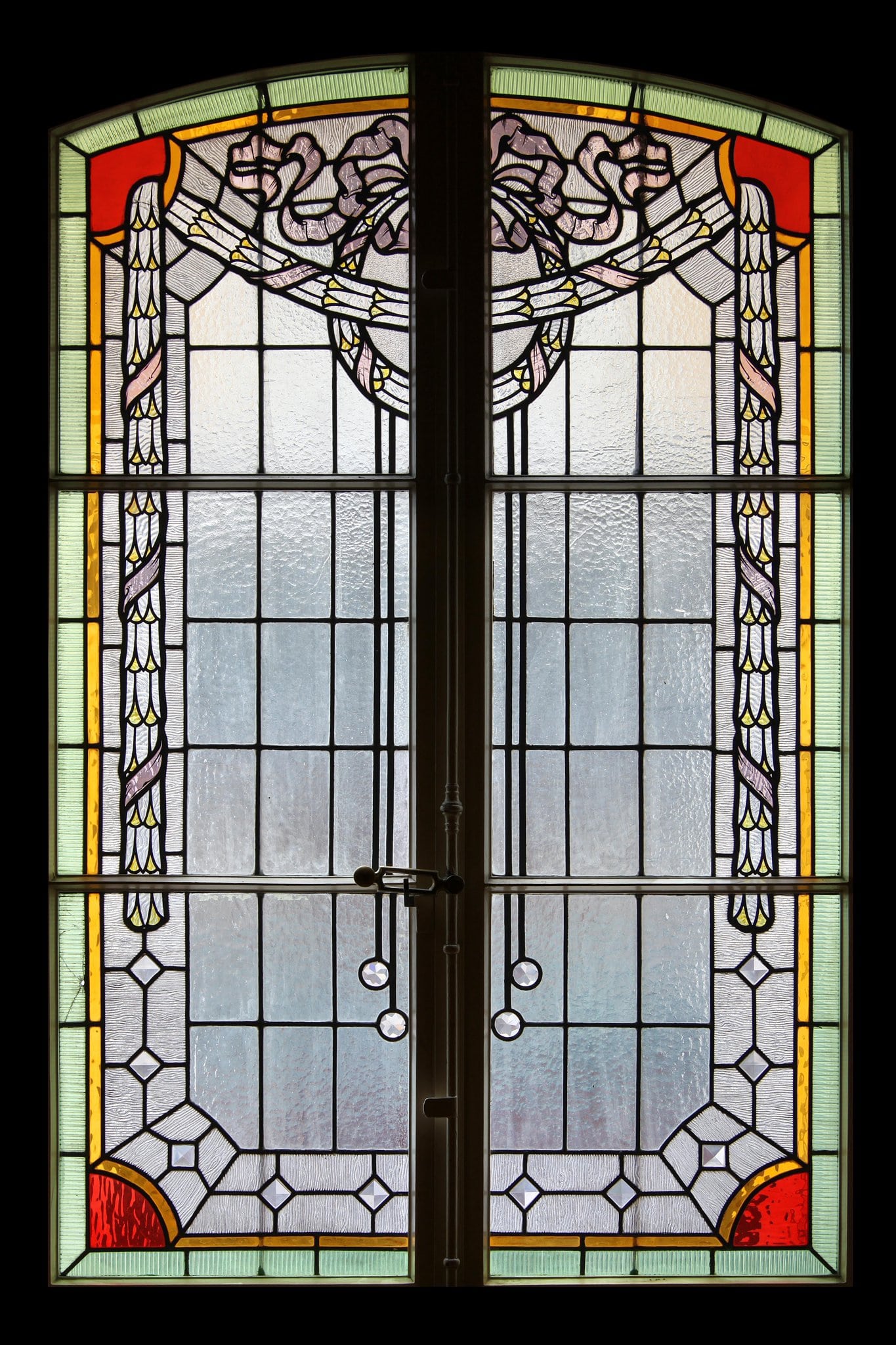 Une guirlande se trouve au sommet du vitrail et retombe sur les côtés du vitrail entouré d’une bordure.
