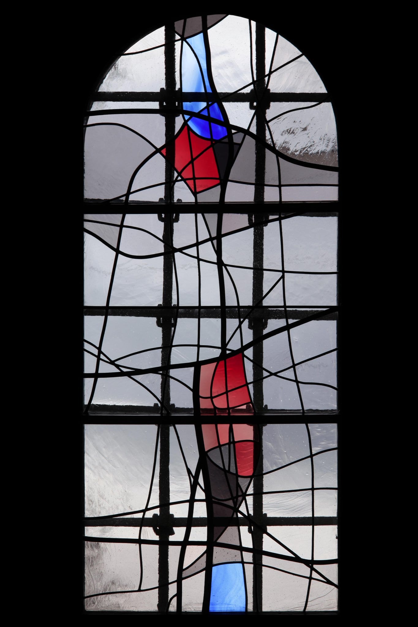 Vitrail non figuratif où les plombs d’épaisseurs différentes apportent une animation rythmique alors que les verres blancs et gris dominent l’ensemble de la fenêtre avec quelques pièces rouges, bleues et grises sur l’axe central vertical.
