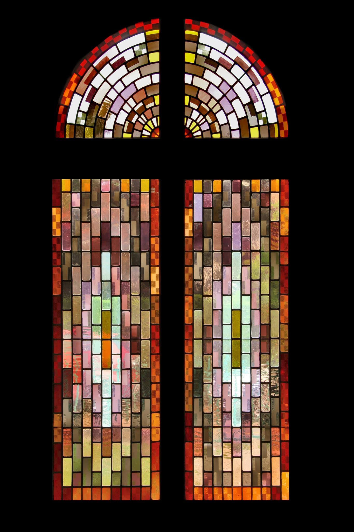 Vitrail ornemental composé de quatre panneaux constitué de verres dans les teintes roses, beiges et brunes. Une fine bordure entoure chacun des panneaux. Une croix se dessine dans l’interstice des quatre panneaux.
