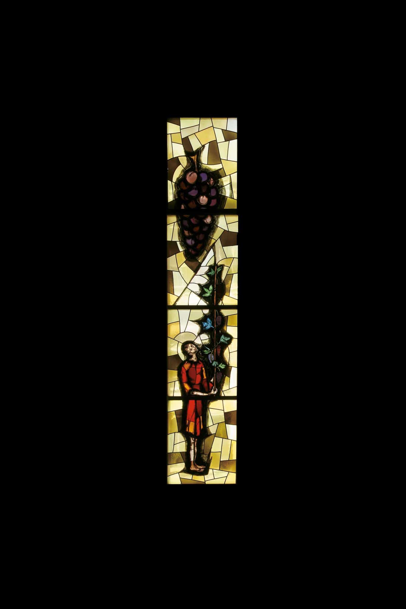 Un homme debout tient un cep de vigne portant des sarments sur lesquels il y a des fruits. Au-dessus une grappe de raisin.