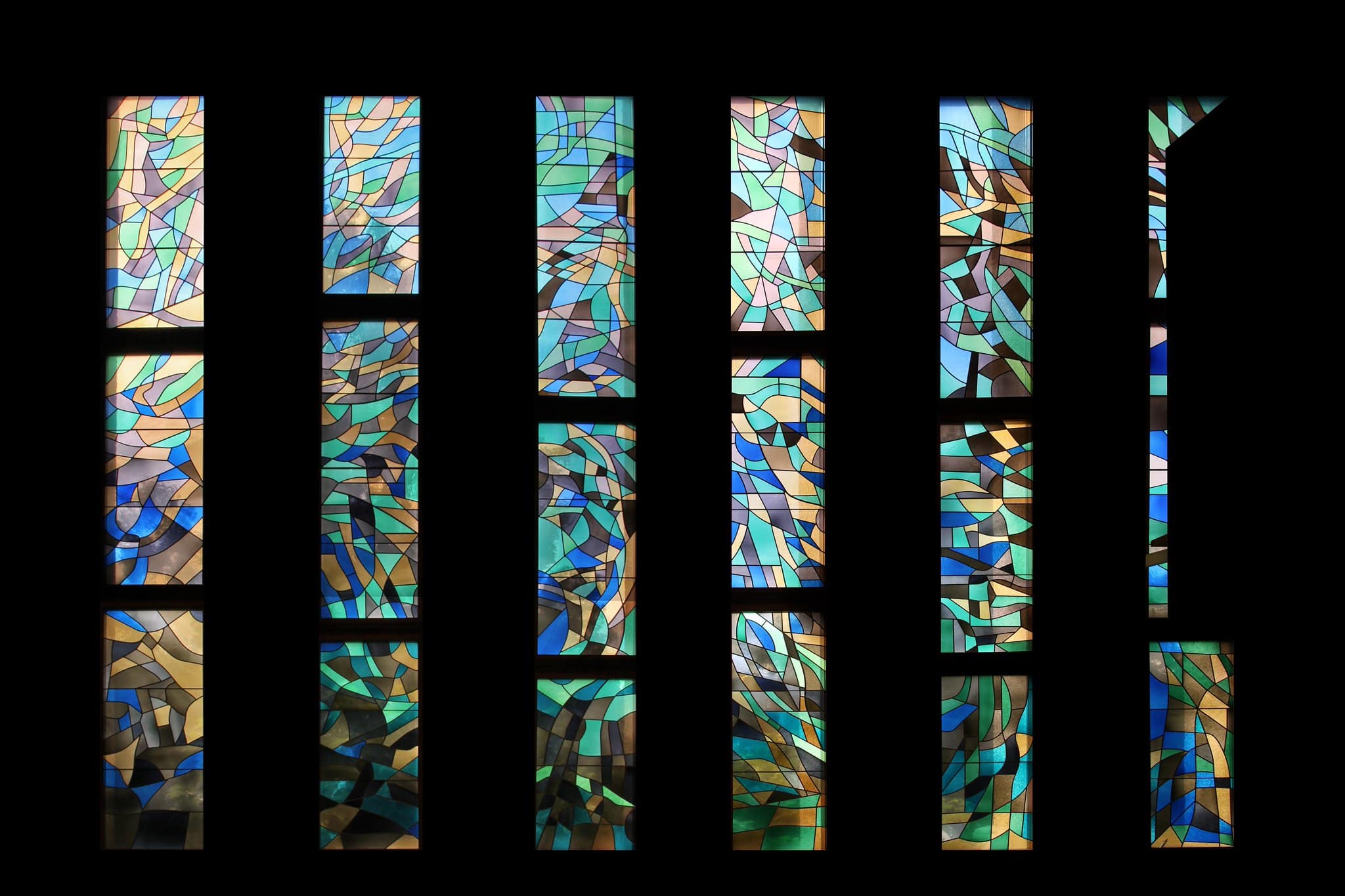 Vitrail non figuratif composé de six panneaux dans les teintes vertes, bleues, beiges, jaunes et brunes. Un immense oiseau est suggéré sur la partie gauche.