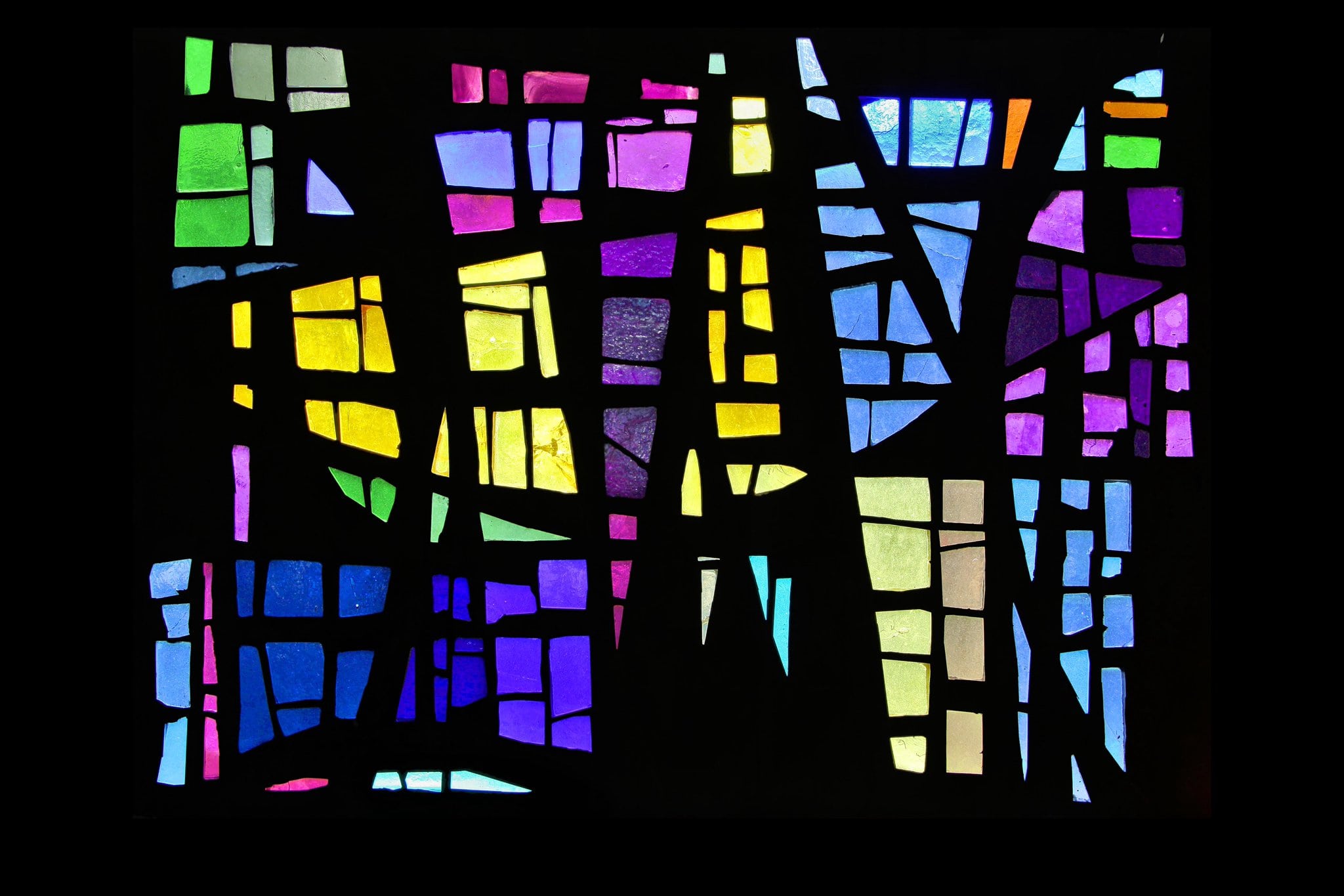 Dalle de verre non figurative composée de verres aux teintes bleues, violettes, rouges, jaunes et blanches. Le béton compose un dessin aux lignes variées.