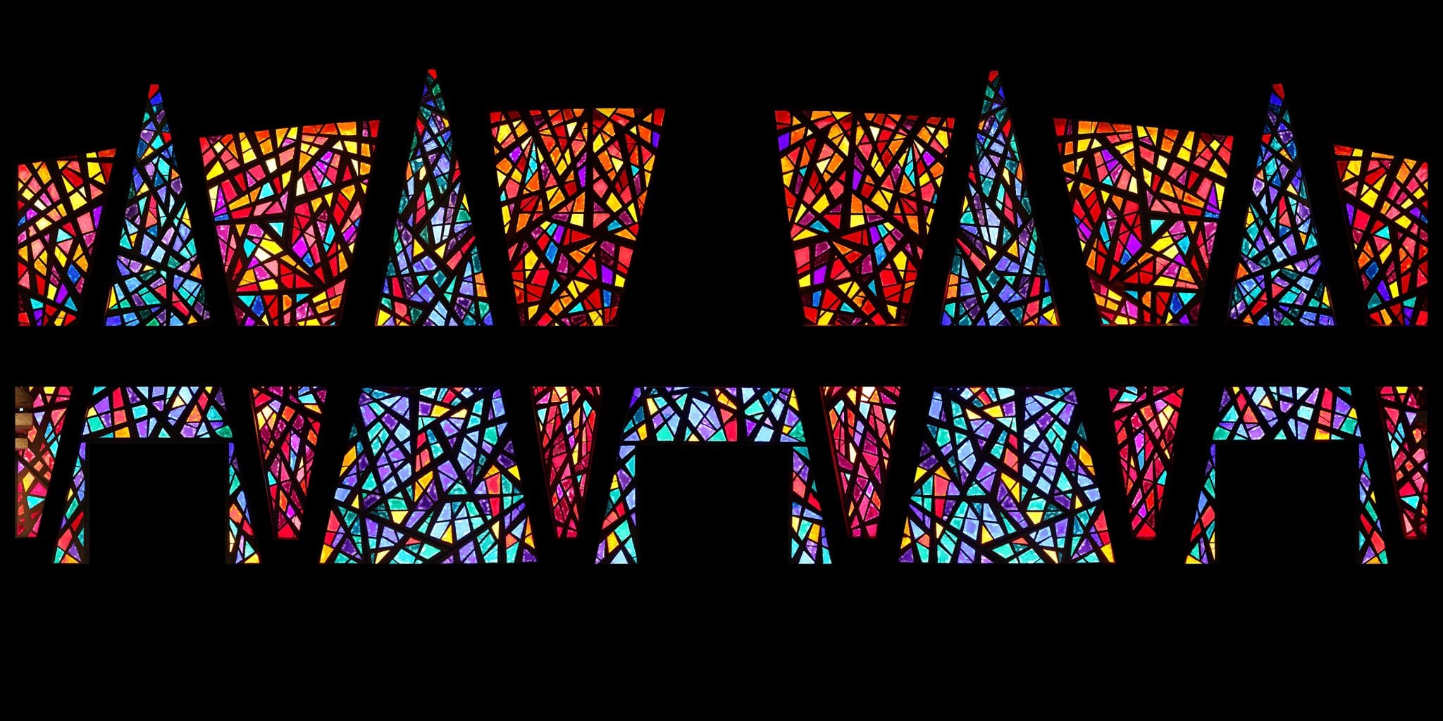 Paroi de dalle de verre non figurative composée de onze sections en triangle alternant les teintes chaudes et les teintes froides.