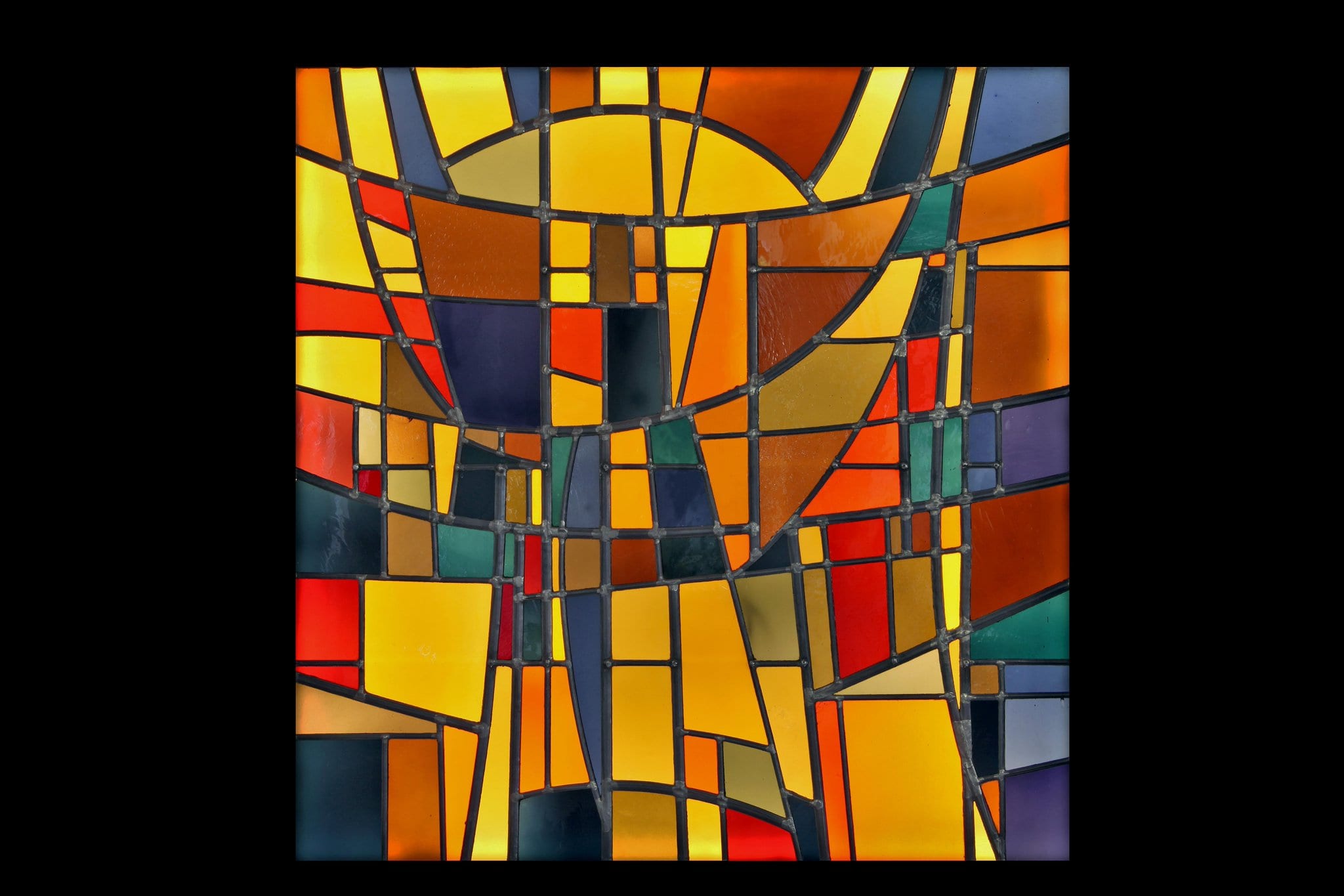 Vitrail non figuratif composé de teintes chaudes avec quelques verres bleus et verts. La vieillesse est symbolisée par un corps aux bras levés vers un soleil couchant.