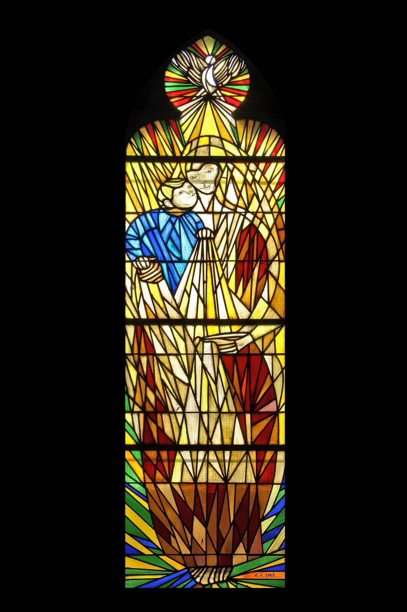 La Vierge, debout, entourée de lumière, porte l’Enfant Jésus dans son bras droit. Au-dessus apparaît une colombe.
