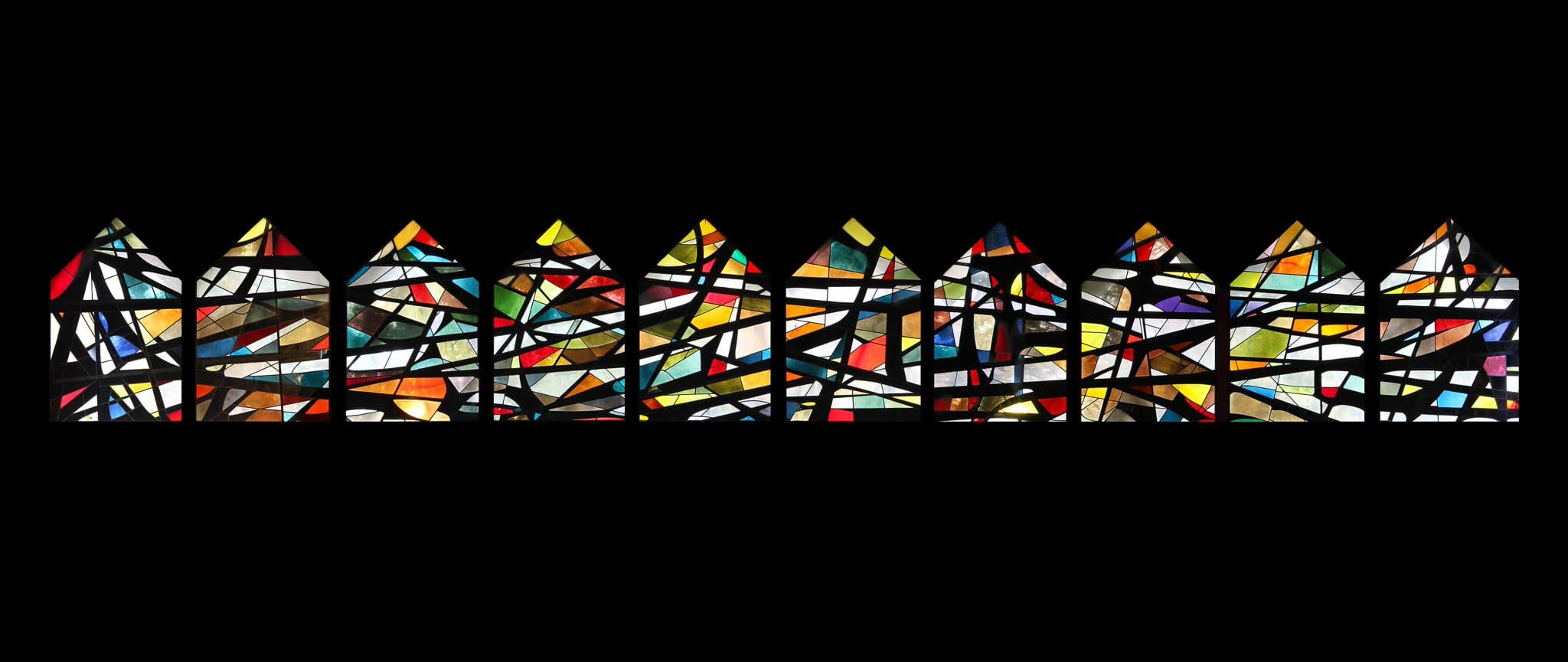 Vitrail monumental abstrait composé de dix panneaux dans les tons de jaune, rouge, noir et blanc.