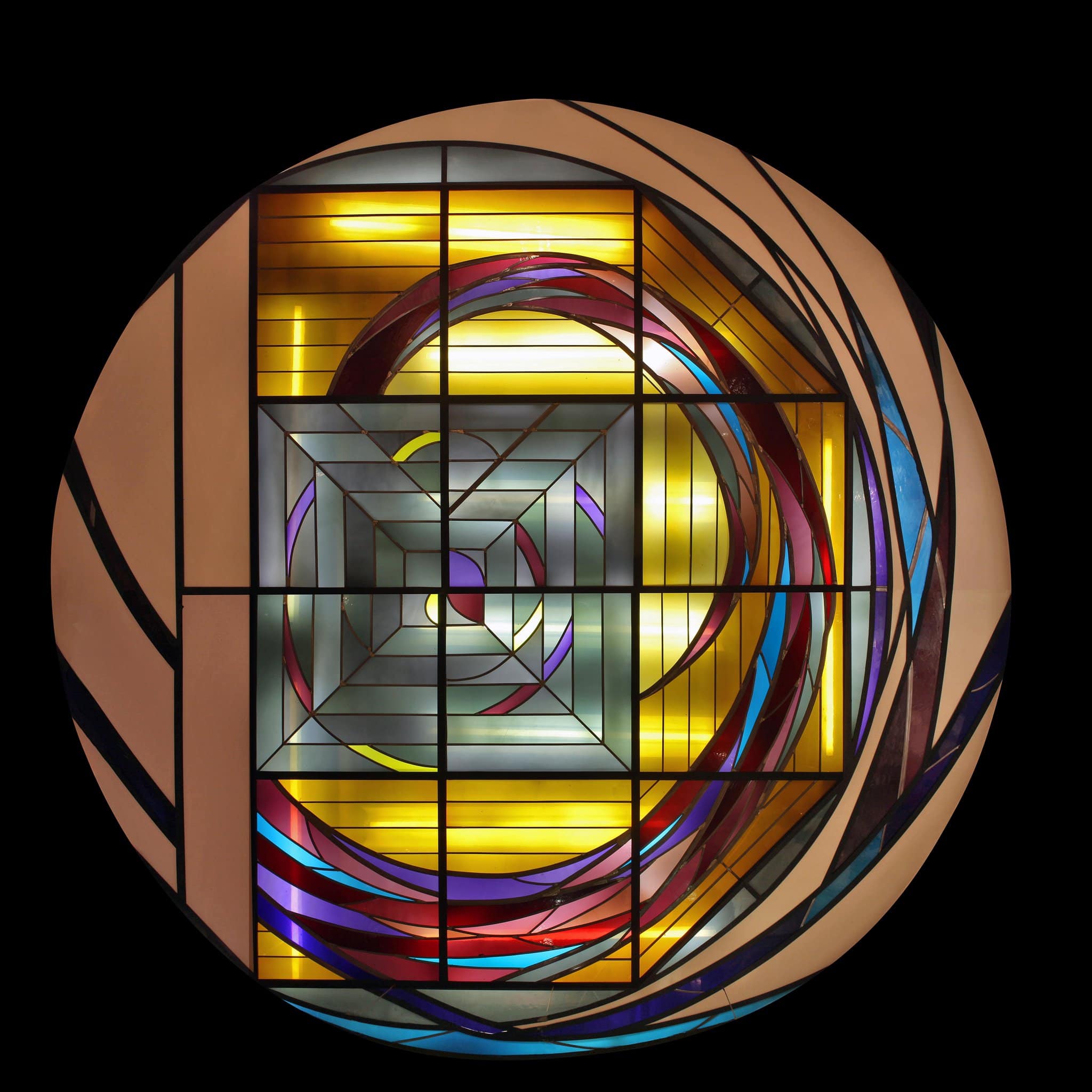 Centre carré aux tons gris entouré d’un fond de verres jaunes et de plaques de métal blanches sur lequel se déploie une spirale dans les teintes rouges, roses, bleues et mauves.