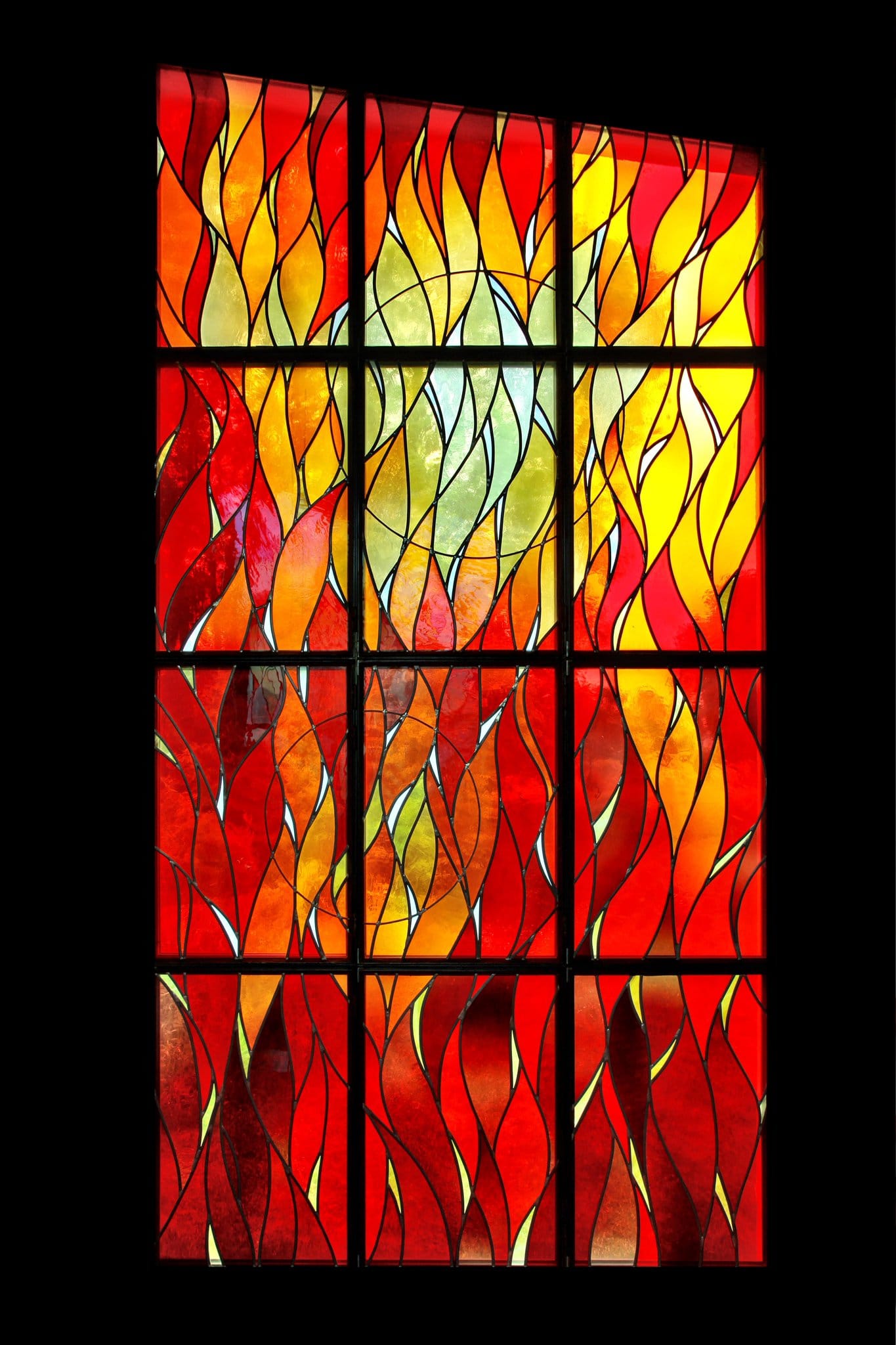 La Vierge et l’Enfant sont suggérés par deux cercles apposés sur des flammes du Buisson ardent. Le tout dans des tons rouges, oranges et jaunes de la lumière du soir.