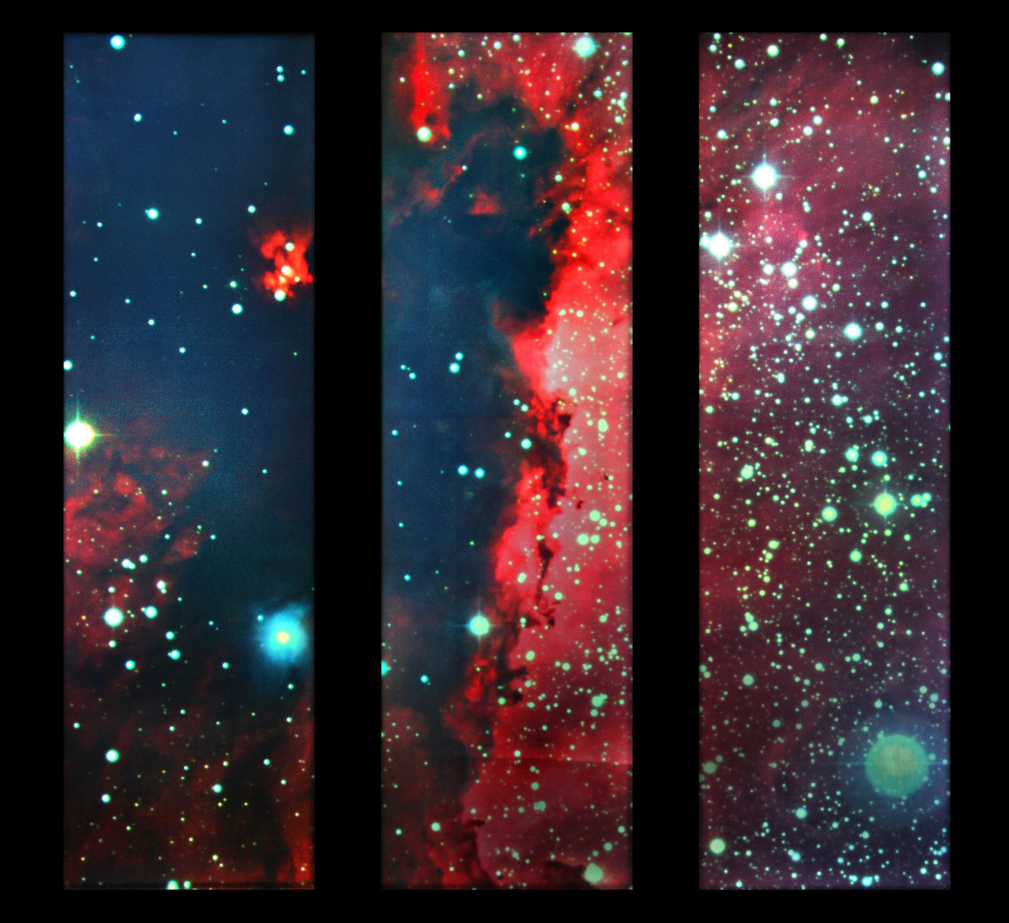 Trois fenêtres représentent des grands nuages de poussières rouges qui sont en train de s’effondrer pour former une nouvelle génération d’étoiles sur un fond bleu avec des étoiles.