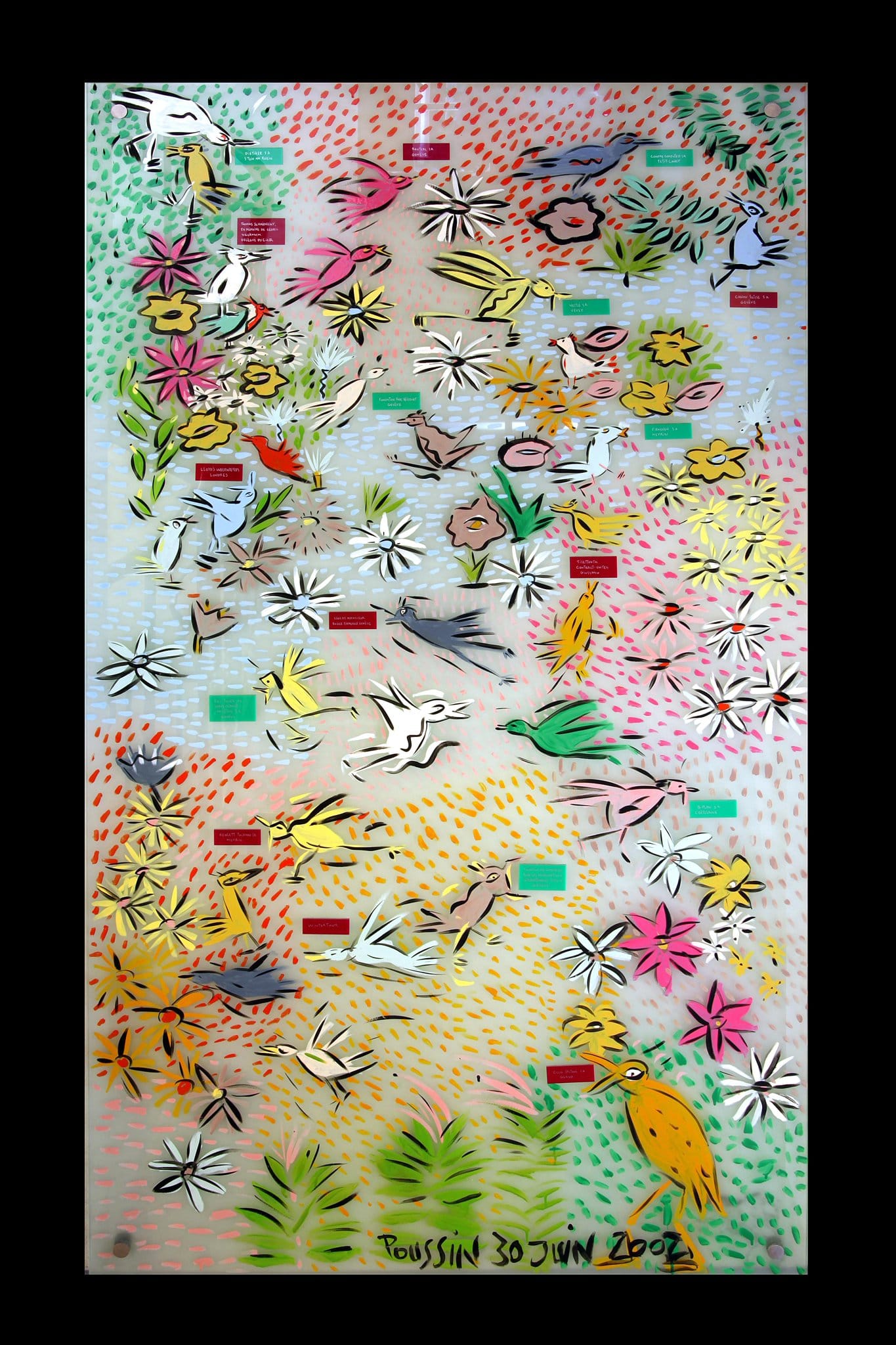Panneau de verre sur lequel se déploie des oiseaux de différentes tailles et de diverses couleurs au milieu des fleurs.