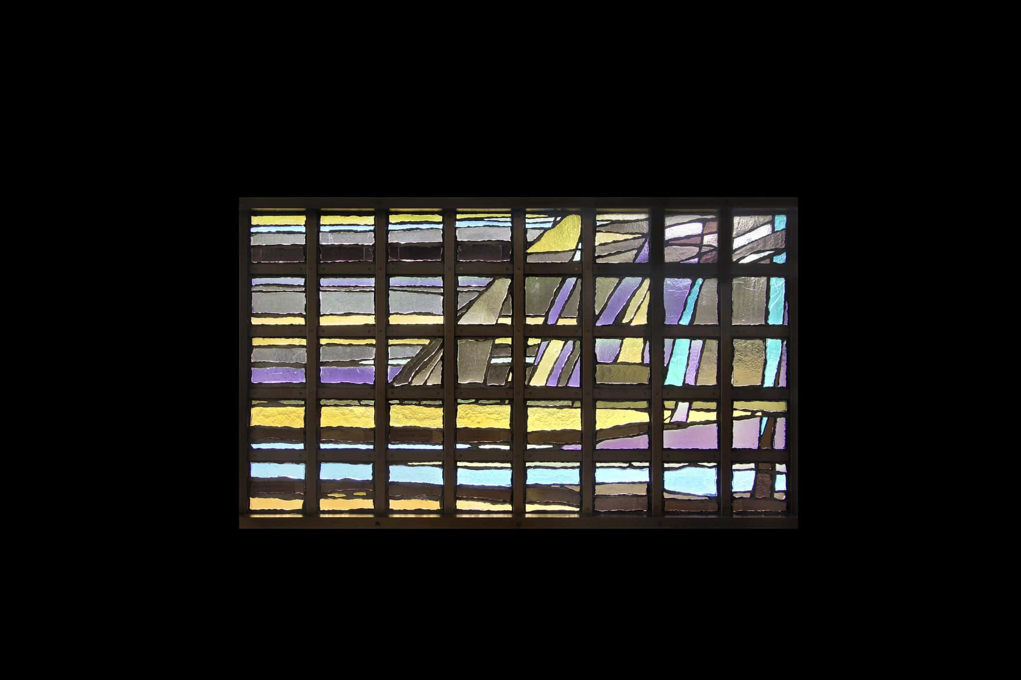 Différentes formes horizontales jaunes, violettes et grises symbolisent la terre alors que des lignes verticales esquissent des arbres. Un quadrillage en aluminium est apposé devant le panneau de verre.