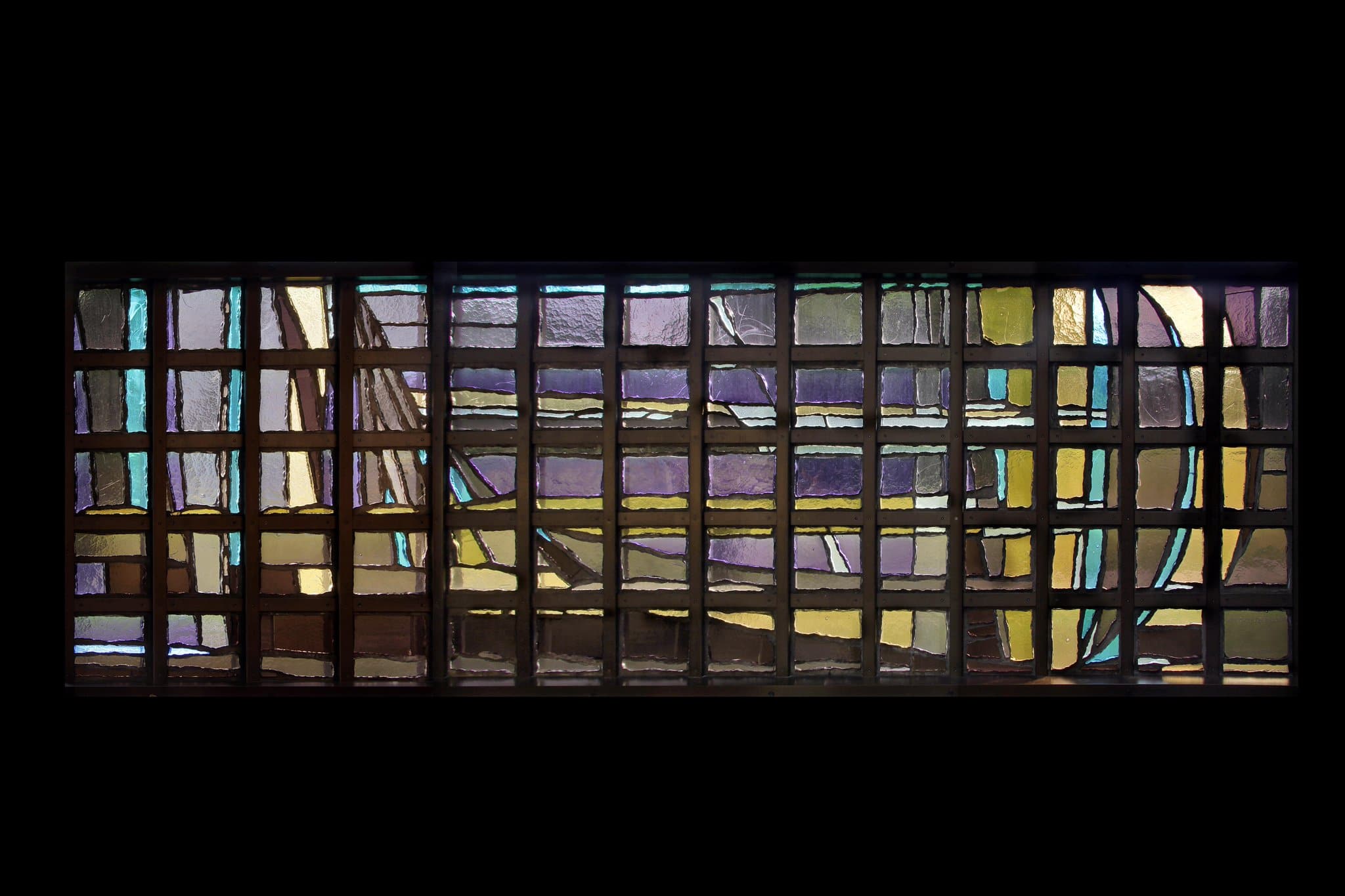 Différentes formes verticales violettes et grises symbolisent des arbres sur un fond de lignes horizontales jaunes, grises et bleues suggérant la terre. Un quadrillage en aluminium est apposé devant le panneau de verre.