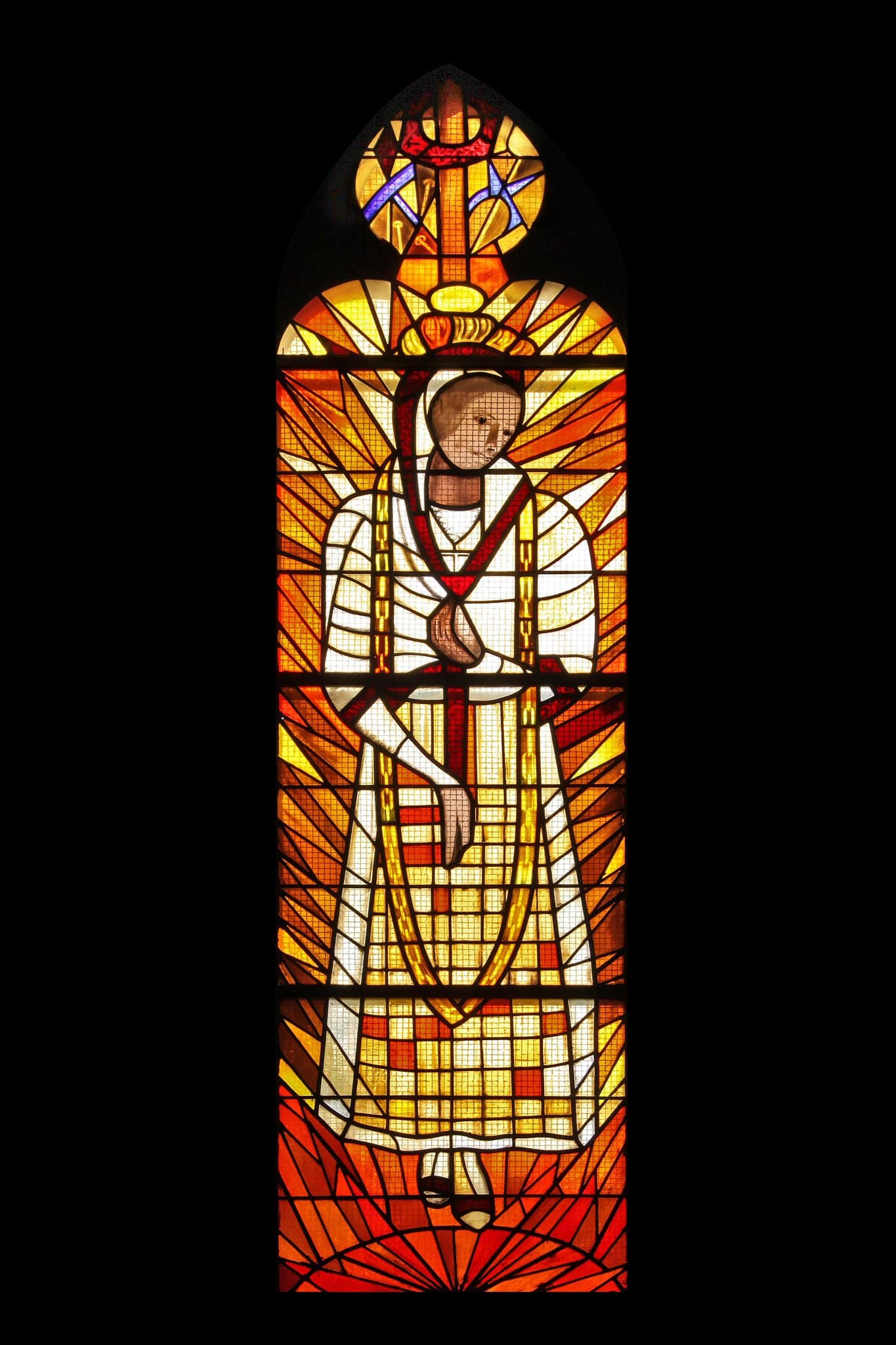 La Vierge, vêtue en habit de paysanne et couronnée, porte une lourde chaîne sur ses épaules. La tête baissée, elle pleure. Une croix apparaît au-dessus avec les instruments de la Passion.
