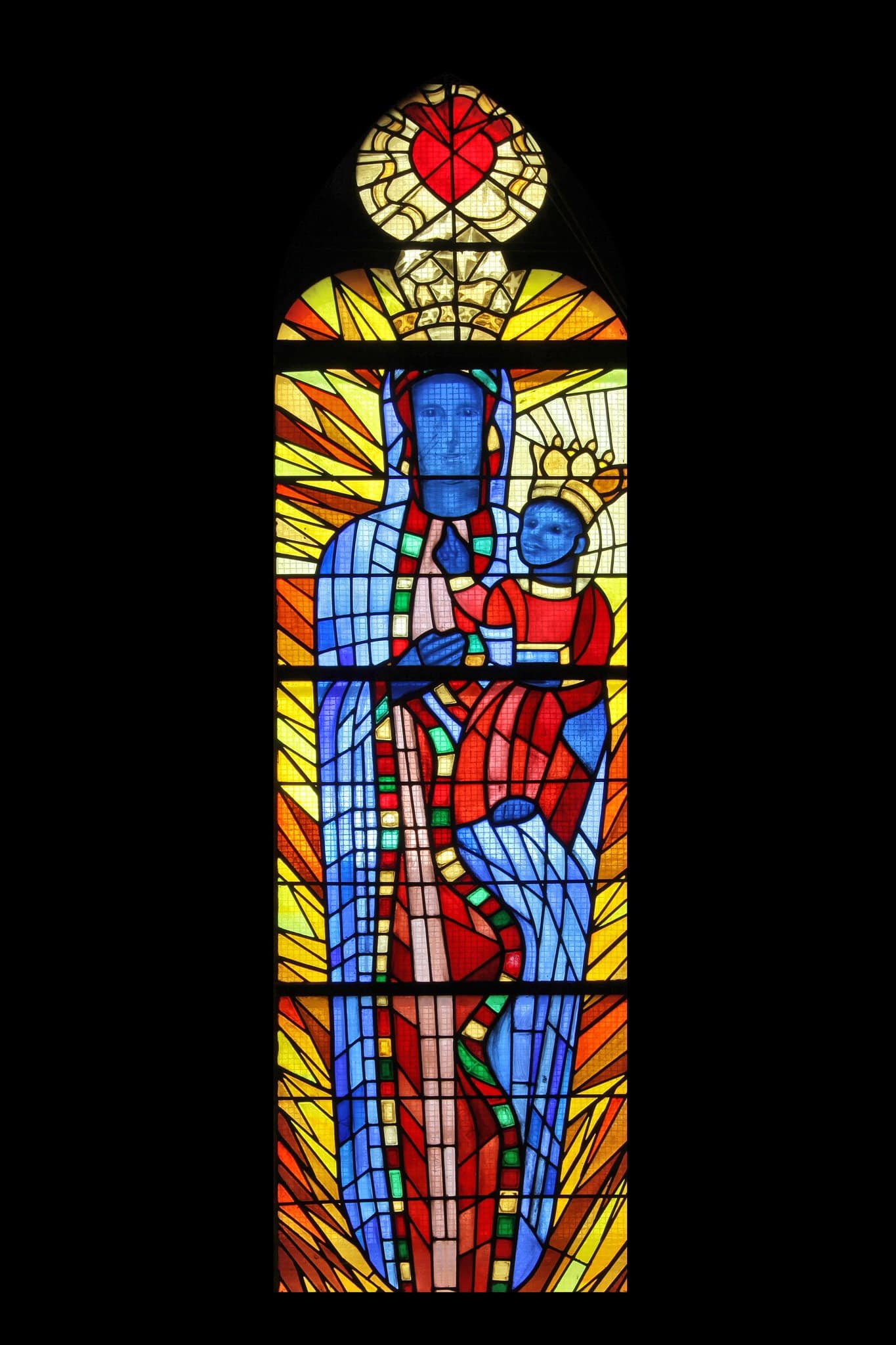 La Vierge, debout, tient l’Enfant Jésus dans son bras gauche. Tous deux sont couronnés. Elle porte des cicatrices sur sa joue droite (signes de la profanation de l’icône polonaise au XVe siècle). Au-dessus apparaît un coeur.