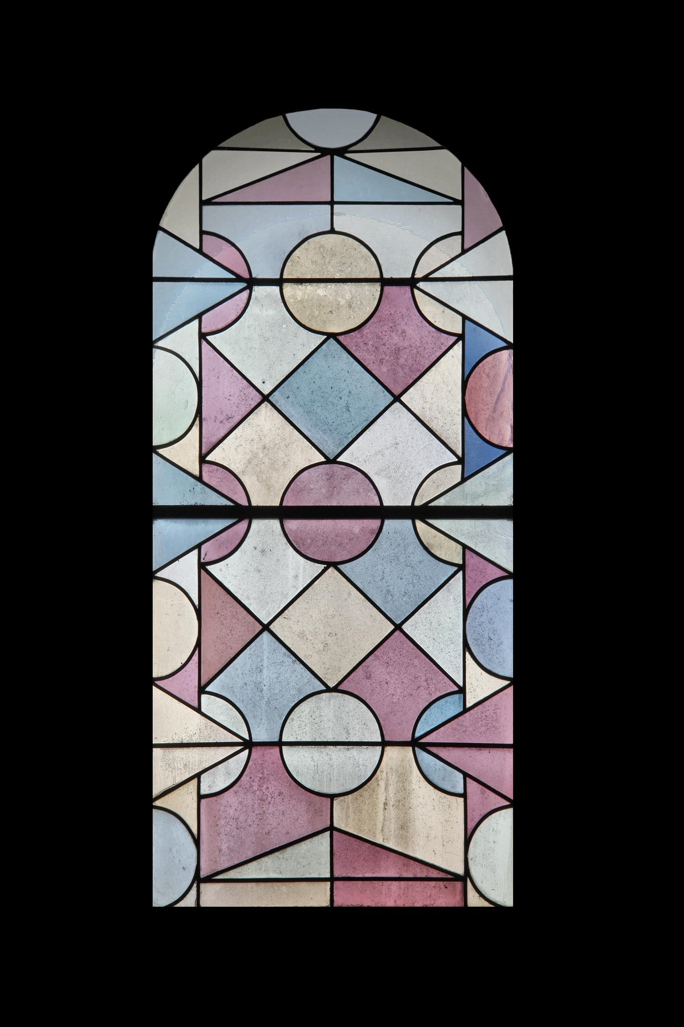 Vitrail ornemental composé de formes géométriques aux teintes grises, roses et blanches.