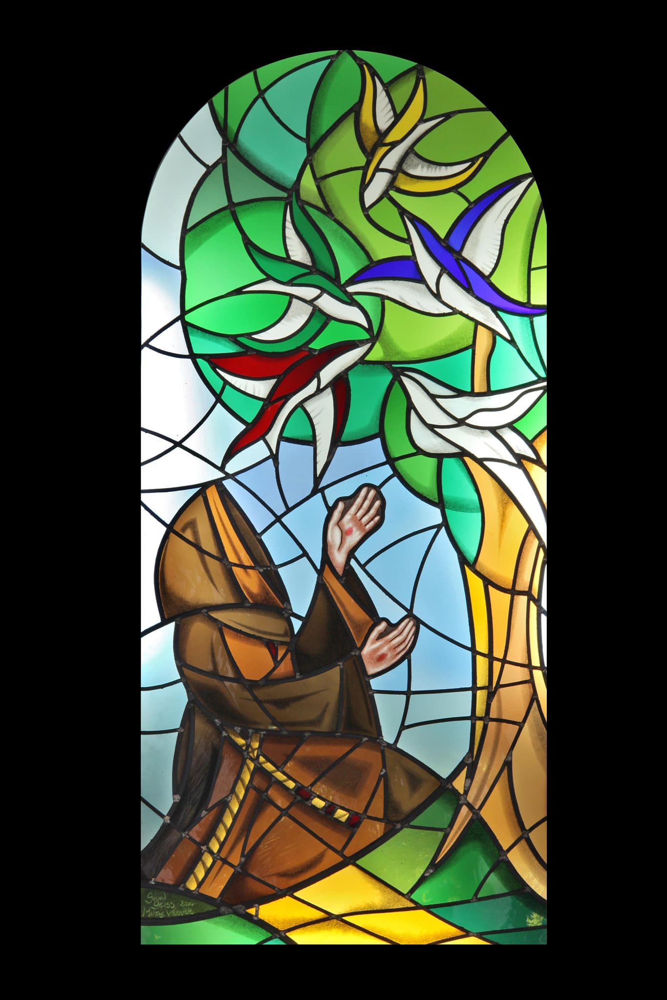 Saint François d’Assise, vêtu de la bure franciscaine et agenouillé devant un arbre, parle aux oiseaux les bras ouverts. Les stigmates sont présents sur ses mains et sa poitrine. Les cinq oiseaux sont de couleur différente pour symboliser les cinq continents.