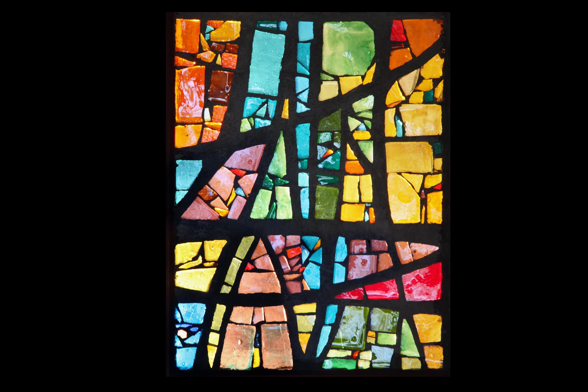 Vitrail non figuratif composé de morceaux de verre de tailles très diverses dans des teintes oranges, bleues, vertes, jaunes et brunes.